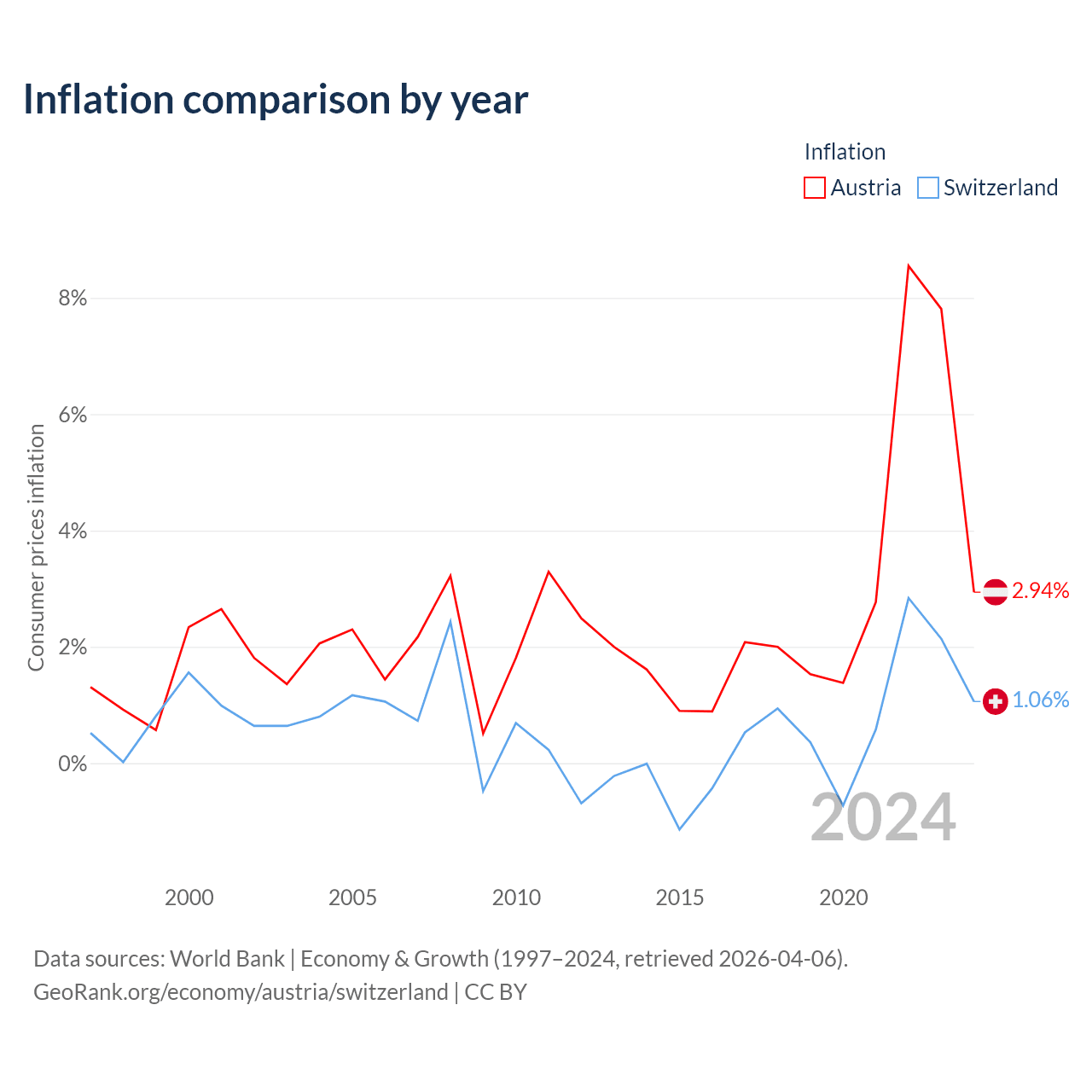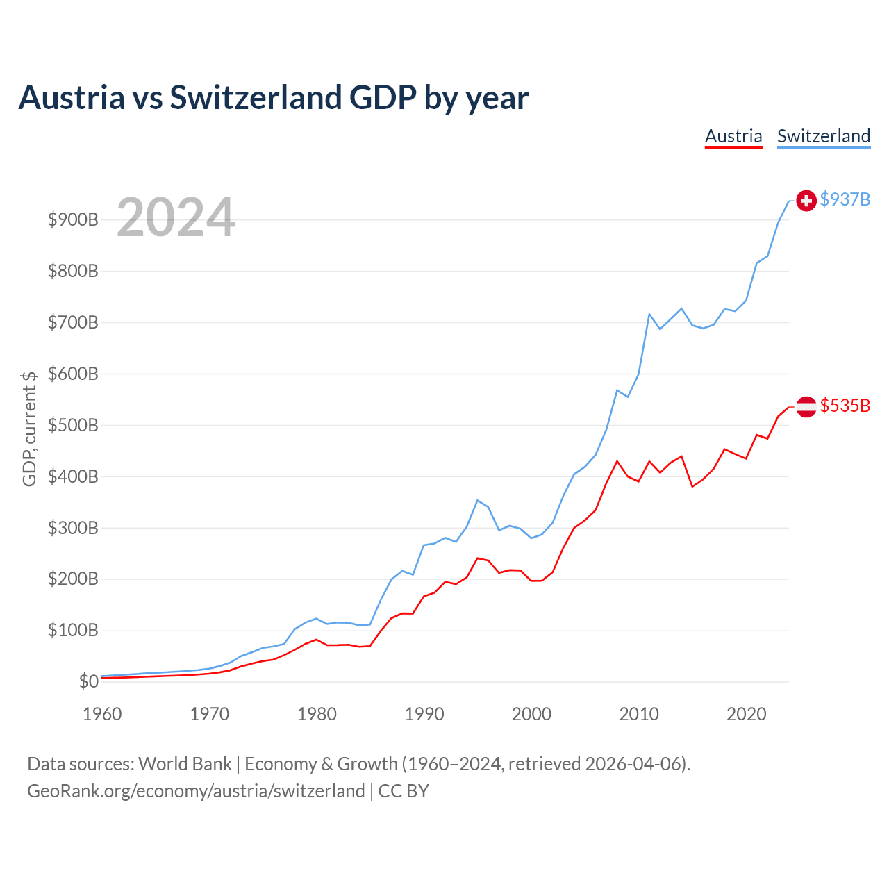 Austria has a GDP of $535B compared to $937B for Switzerland, ranking 30/197 and 20/197 by economy size, respectively.