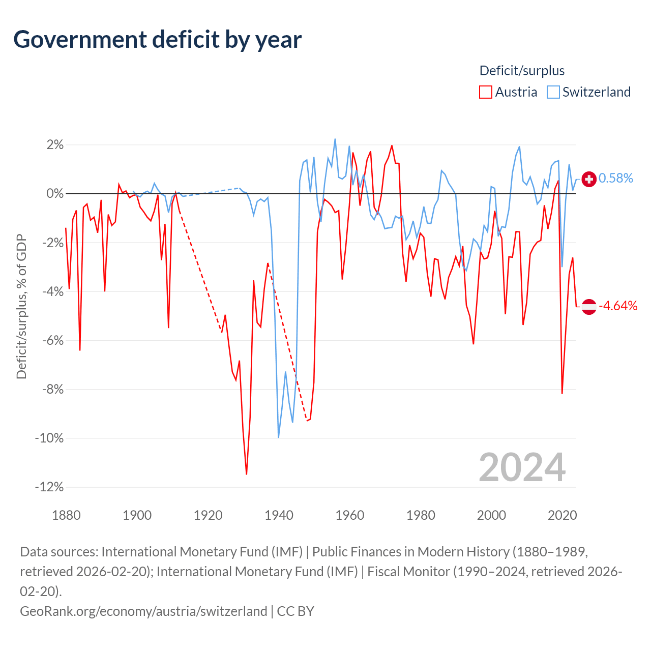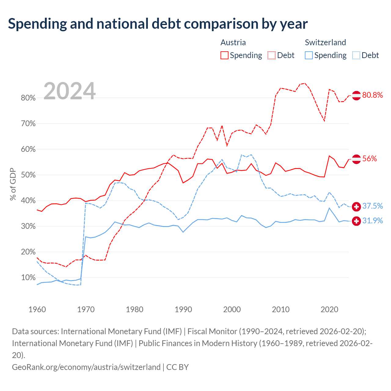 Austria has $432B in government debt (80.8% of GDP), compared to $351B (37.5% of GDP) in Switzerland.