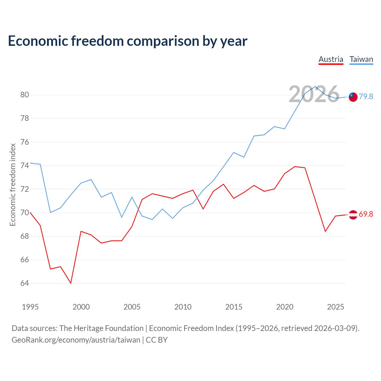 The Economic Freedom Index for Austria is 69.8, ranking 38/197, compared to 79.8 for Taiwan, ranking 6/197. The chart above displays a comparison of annual changes in economic freedom indexes.