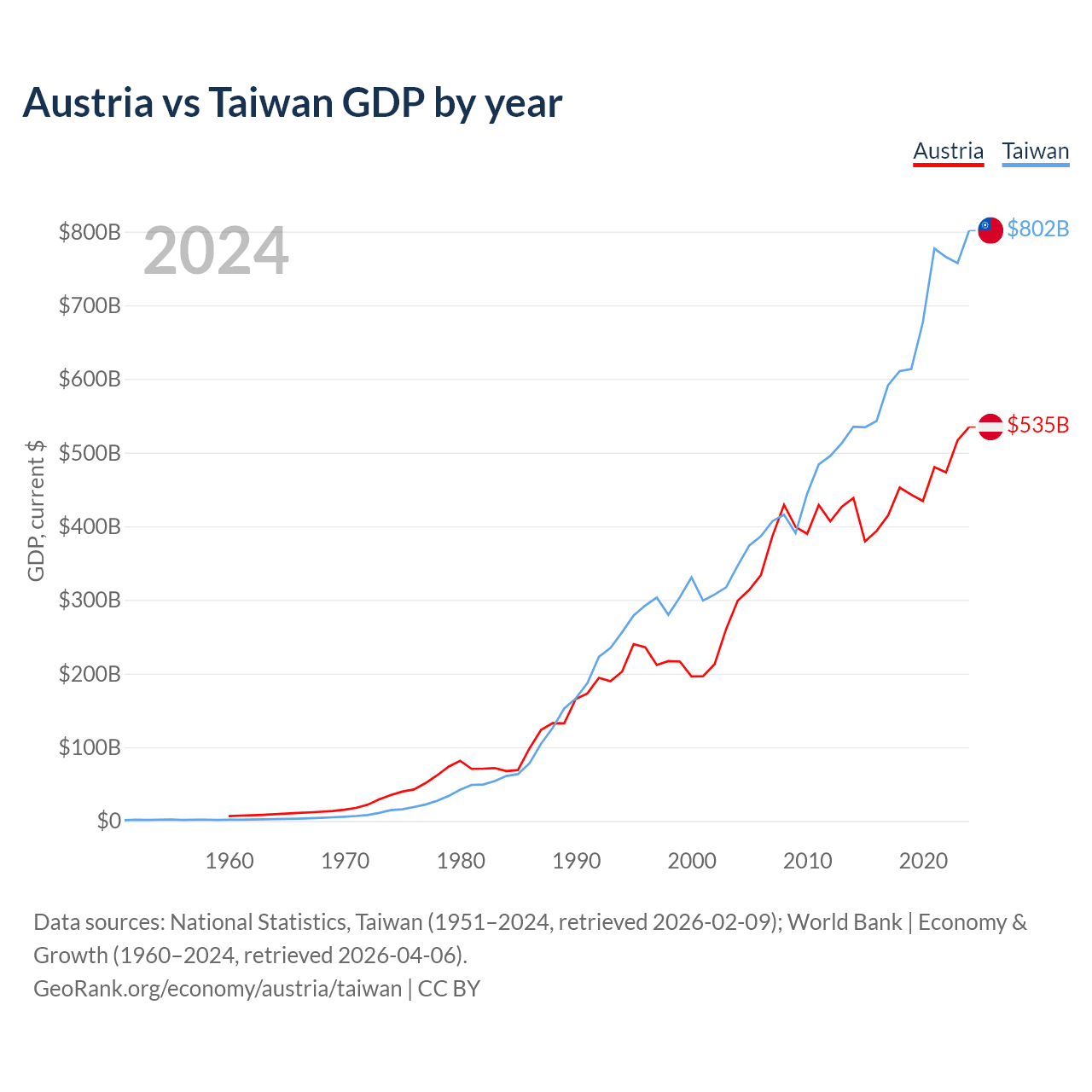 Austria vs Taiwan GDP by year