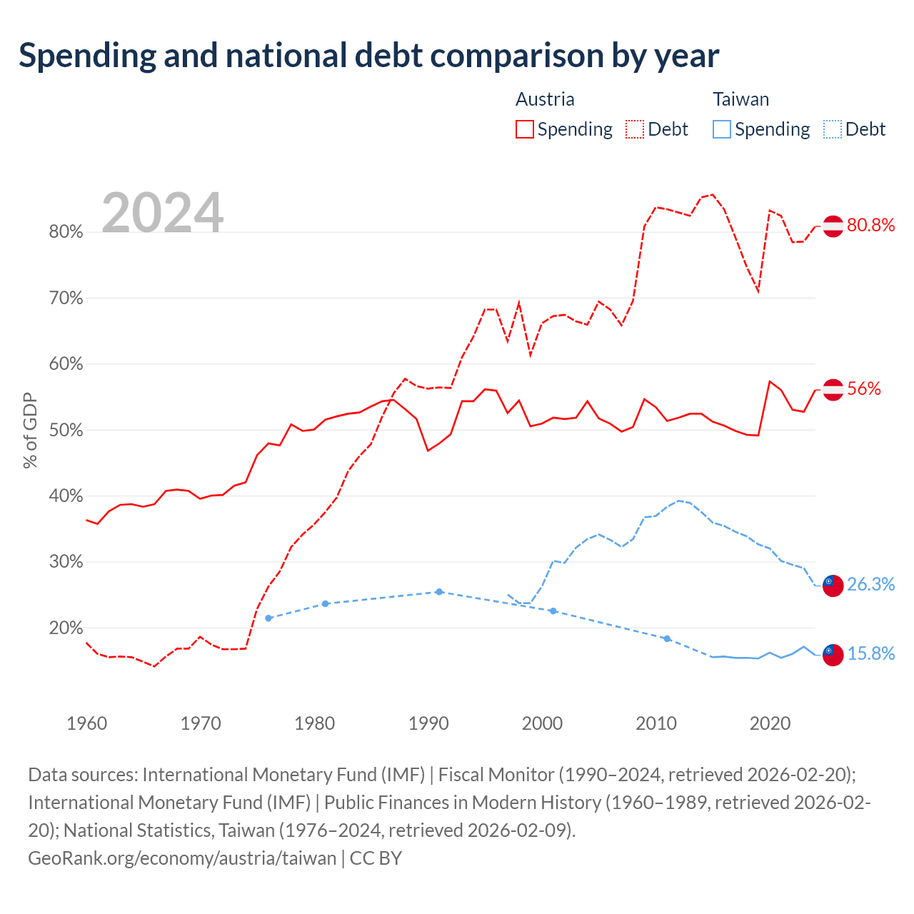 Austria has $432B in government debt (80.8% of GDP), compared to $211B (26.3% of GDP) in Taiwan.