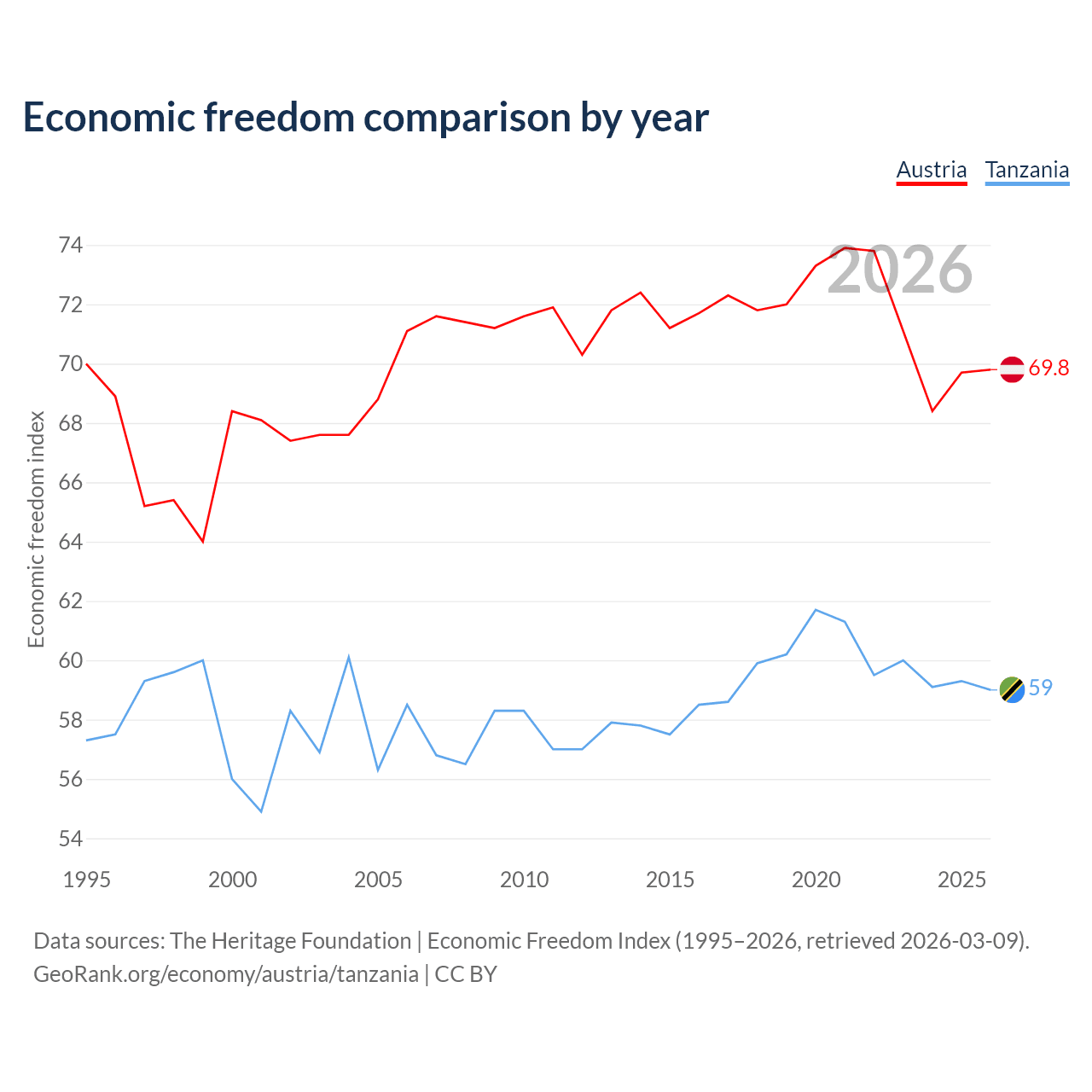 The Economic Freedom Index for Austria is 69.8, ranking 38/197, compared to 59 for Tanzania, ranking 106/197. The chart above displays a comparison of annual changes in economic freedom indexes.