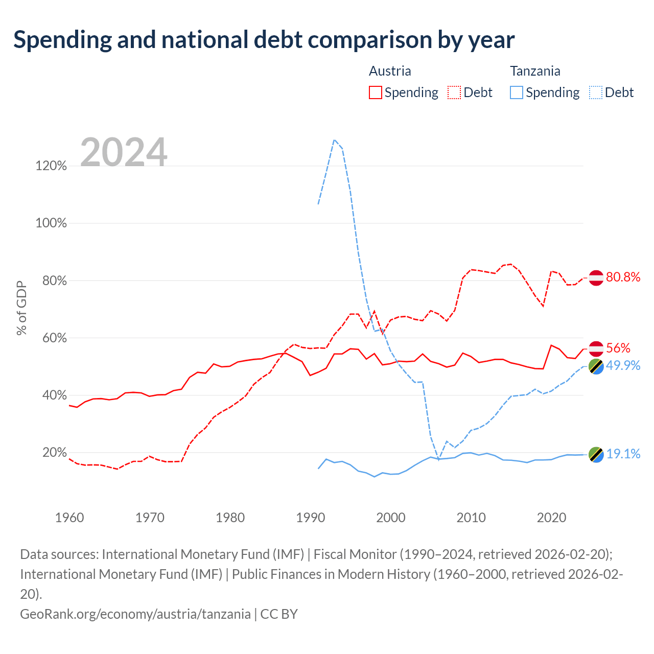 Austria has $432B in government debt (80.8% of GDP), compared to $39.3B (49.9% of GDP) in Tanzania.