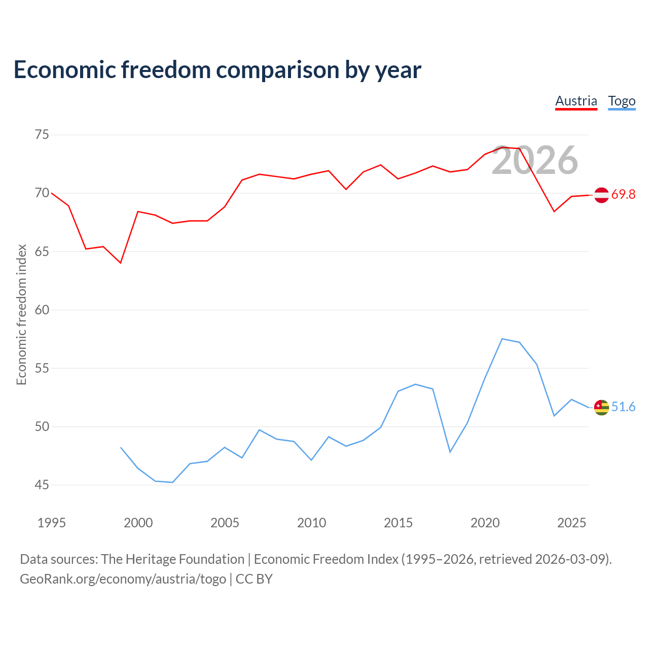 The Economic Freedom Index for Austria is 69.8, ranking 38/197, compared to 51.6 for Togo, ranking 153/197. The chart above displays a comparison of annual changes in economic freedom indexes.