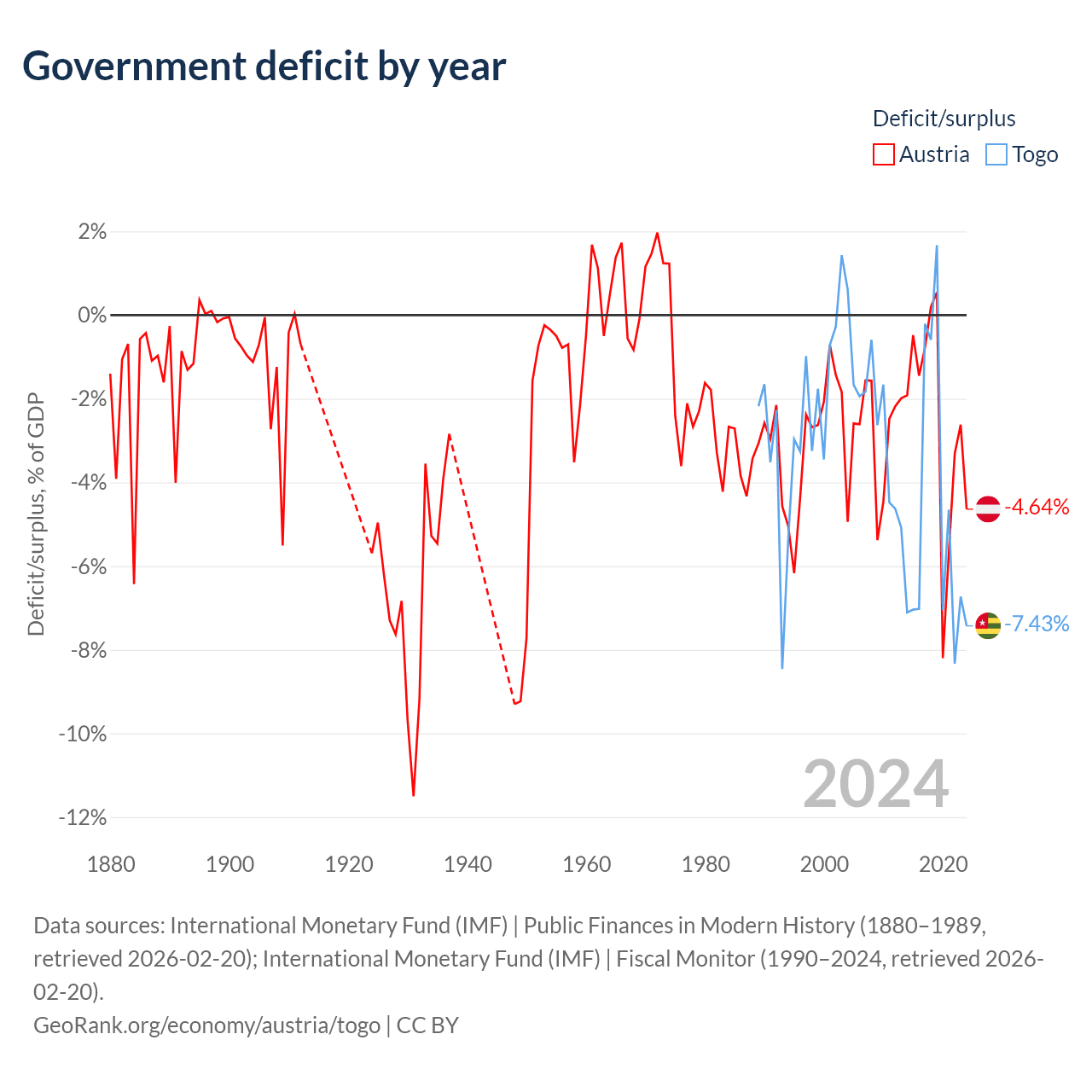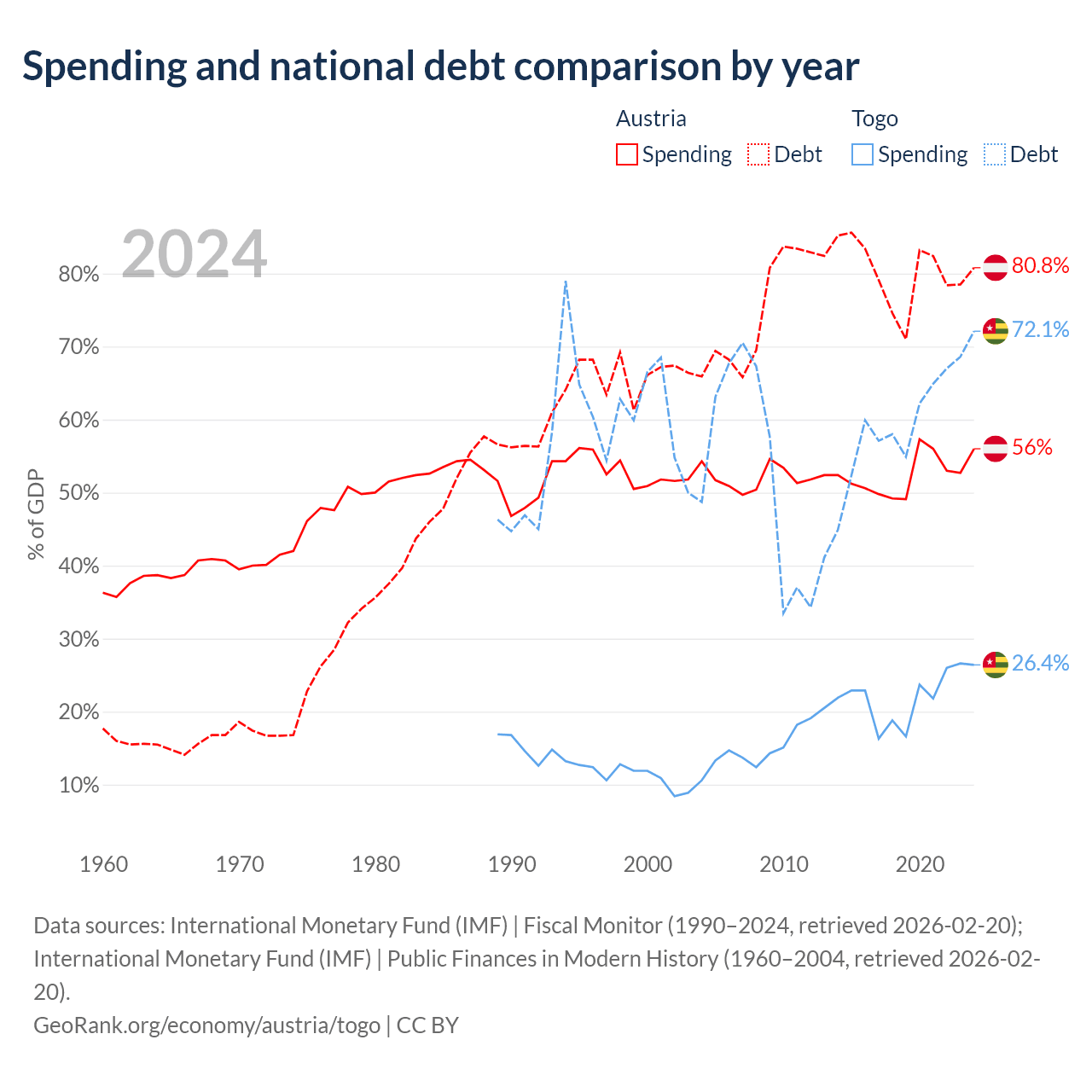 Austria has $432B in government debt (80.8% of GDP), compared to $7.68B (72.1% of GDP) in Togo.