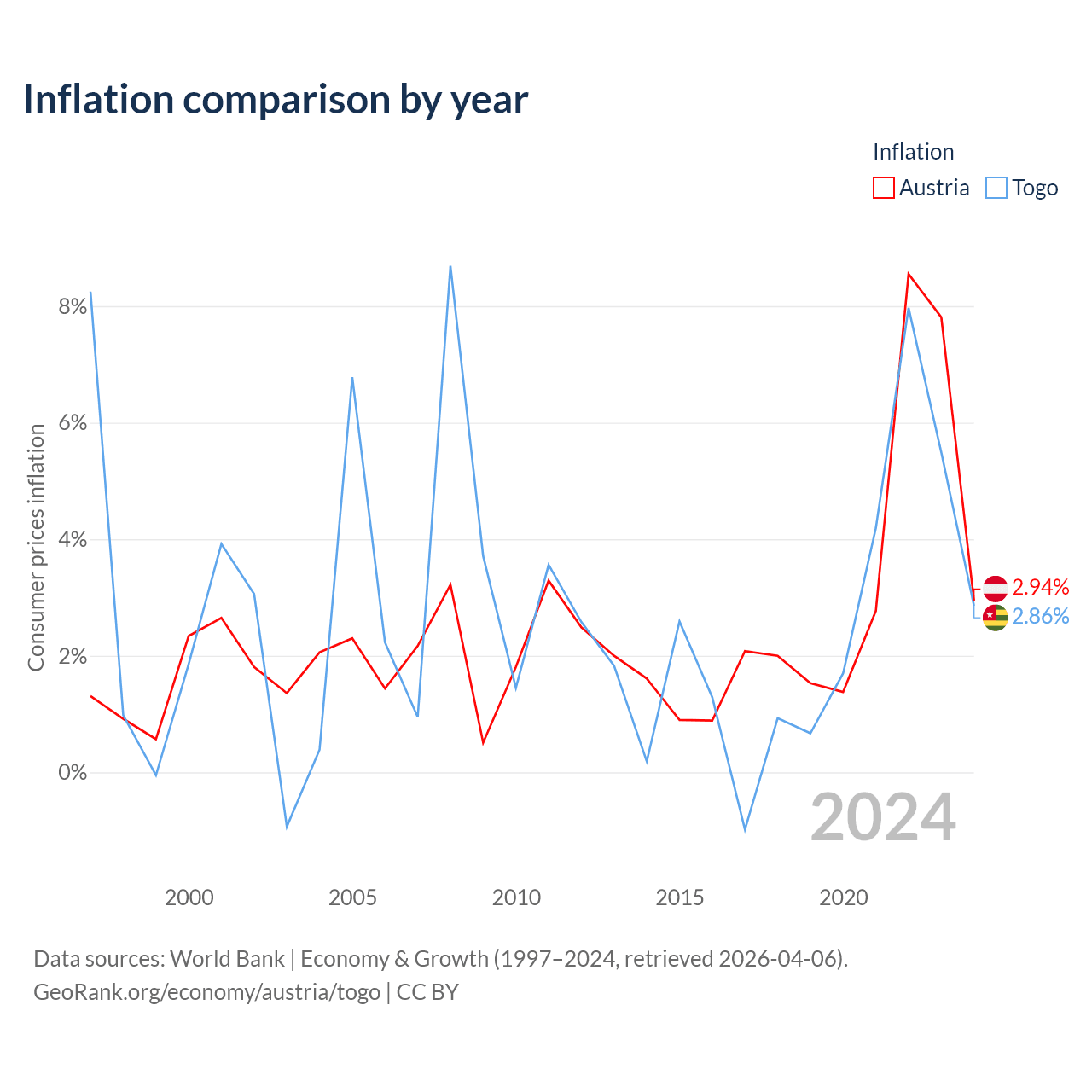 Austria has a GDP of $535B compared to $10.7B for Togo, ranking 30/197 and 154/197 by economy size, respectively.