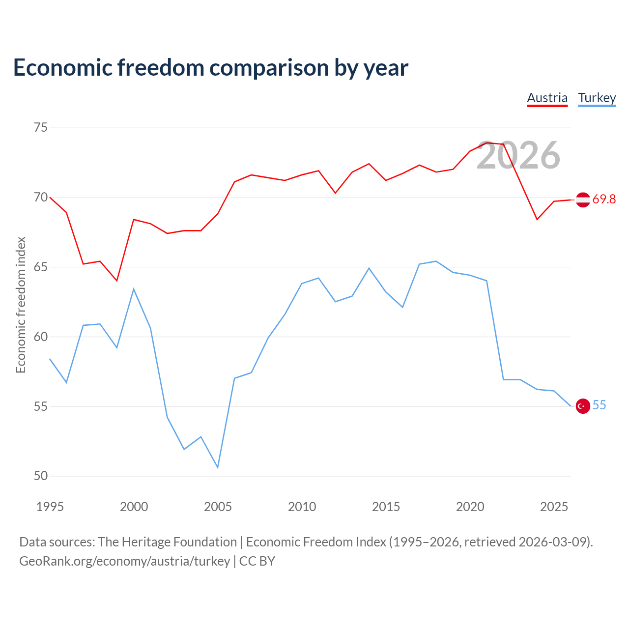 The Economic Freedom Index for Austria is 69.8, ranking 38/197, compared to 55 for Turkey, ranking 129/197. The chart above displays a comparison of annual changes in economic freedom indexes.