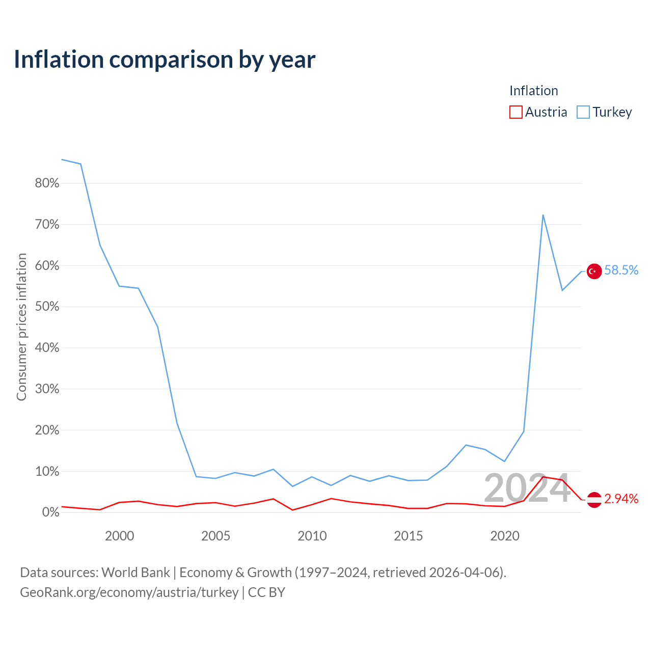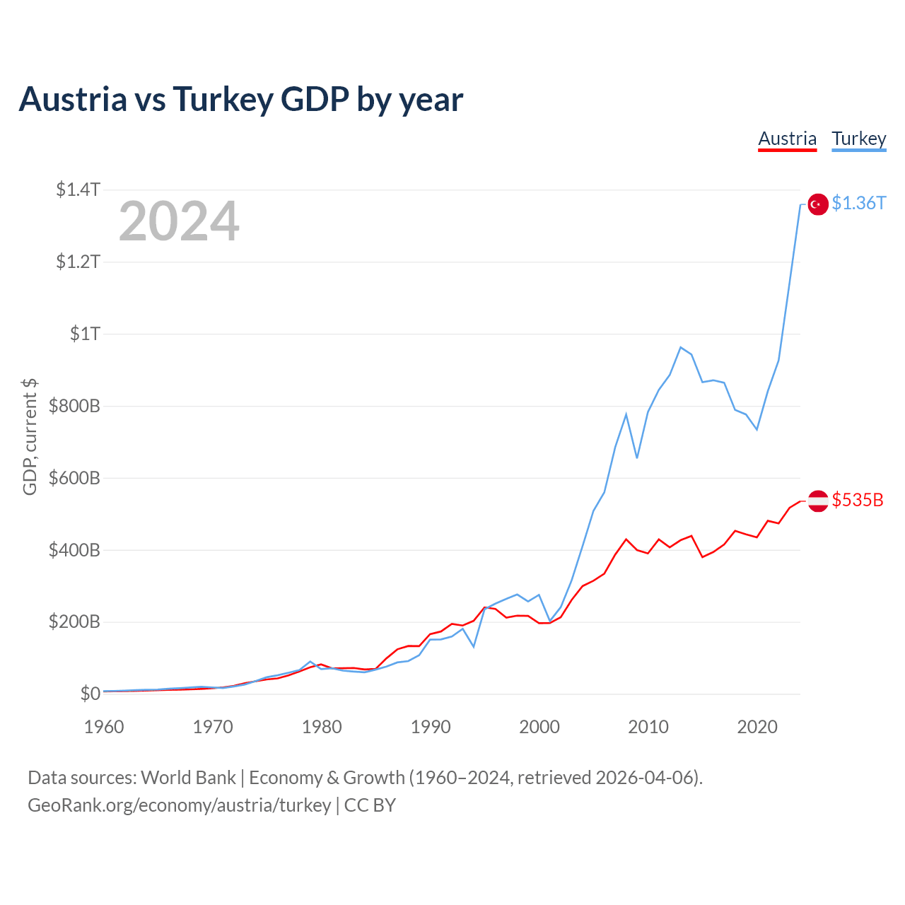 Austria has a GDP of $535B compared to $1.36T for Turkey, ranking 30/197 and 17/197 by economy size, respectively.