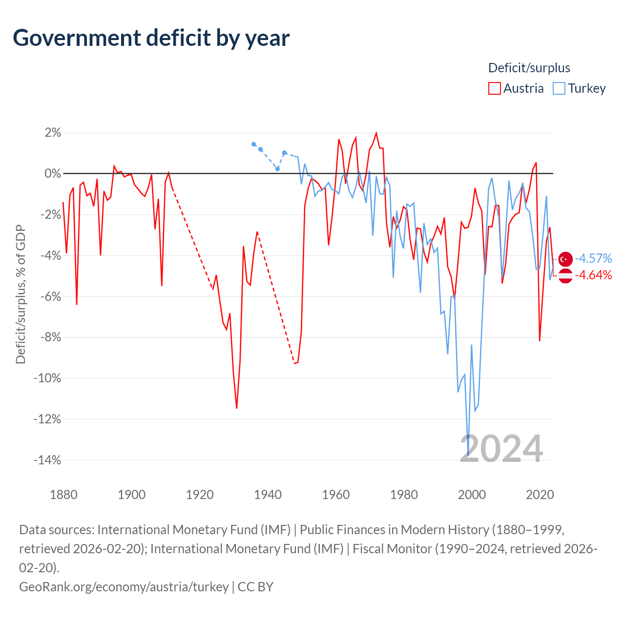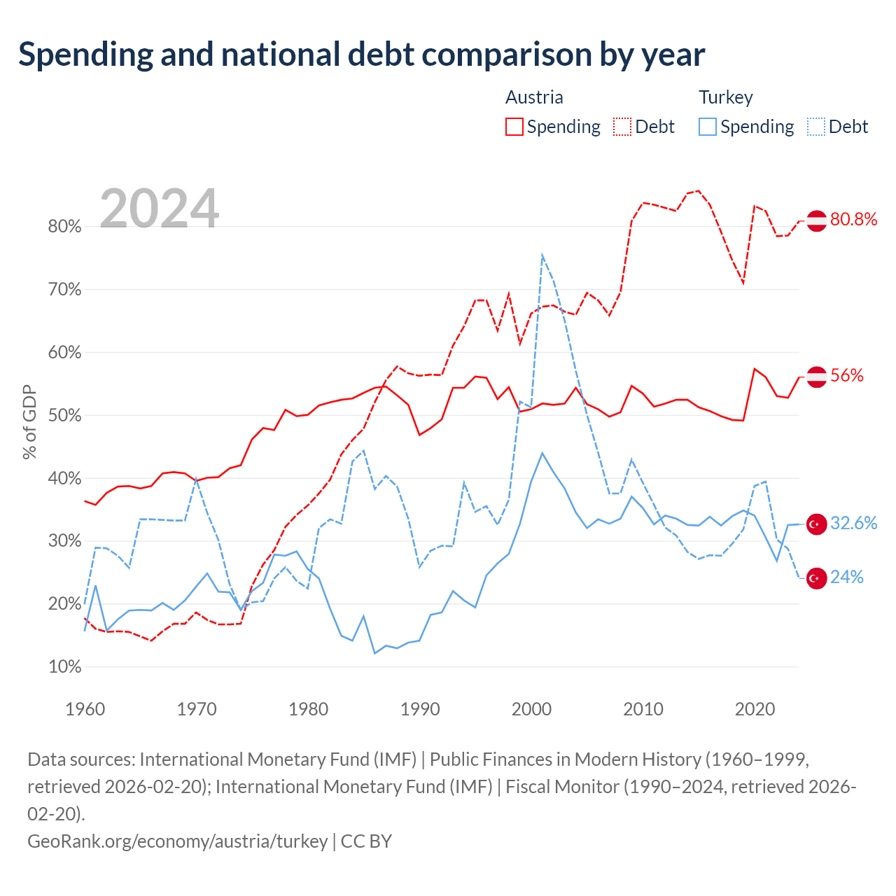 Austria has $432B in government debt (80.8% of GDP), compared to $327B (24% of GDP) in Turkey.