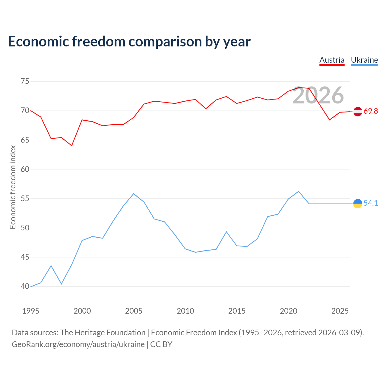 The Economic Freedom Index for Austria is 69.8, ranking 38/197, compared to 54.1 for Ukraine, ranking 135/197. The chart above displays a comparison of annual changes in economic freedom indexes.