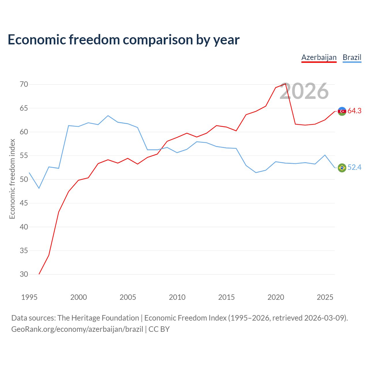 The Economic Freedom Index for Azerbaijan is 64.3, ranking 74/197, compared to 52.4 for Brazil, ranking 148/197. The chart above displays a comparison of annual changes in economic freedom indexes.