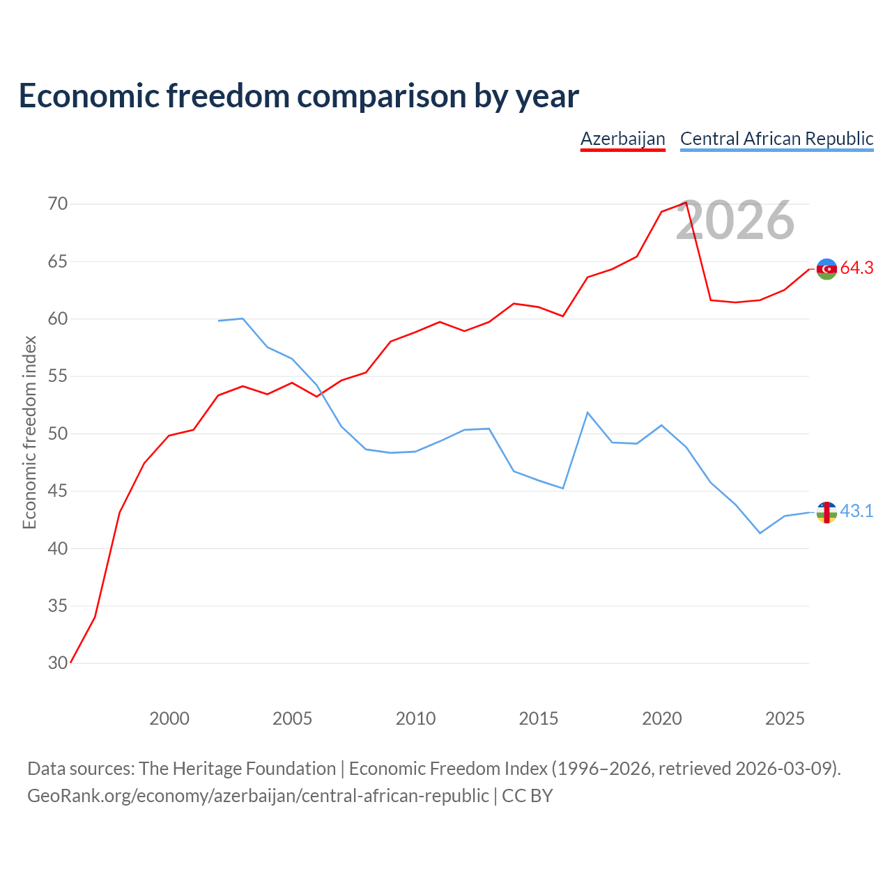 The Economic Freedom Index for Azerbaijan is 64.3, ranking 74/197, compared to 43.1 for the Central African Republic, ranking 182/197. The chart above displays a comparison of annual changes in economic freedom indexes.