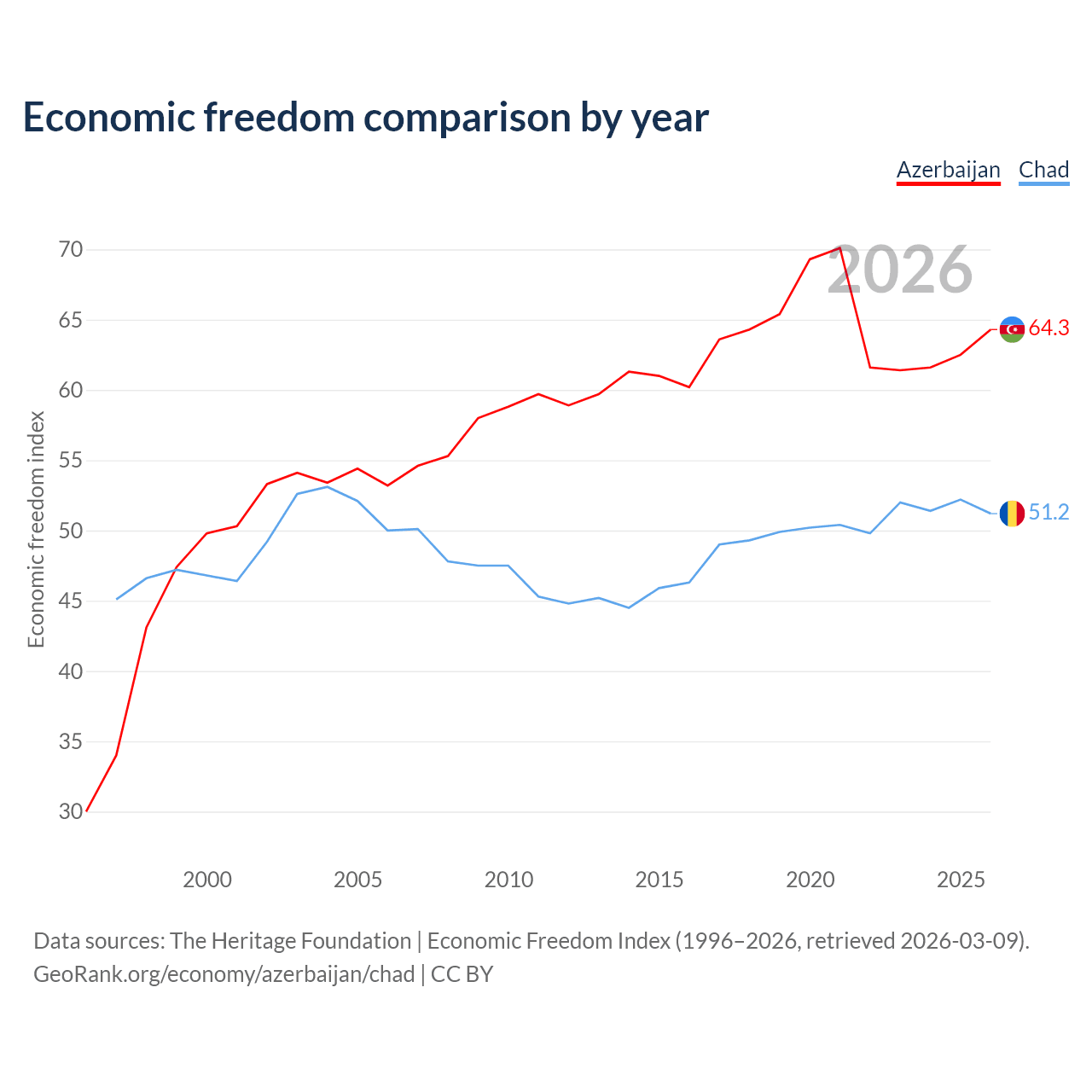 The Economic Freedom Index for Azerbaijan is 64.3, ranking 74/197, compared to 51.2 for Chad, ranking 154/197. The chart above displays a comparison of annual changes in economic freedom indexes.