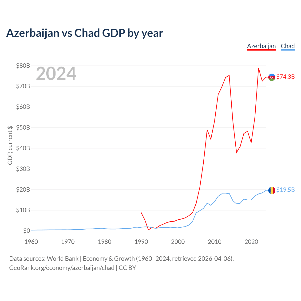 Azerbaijan has a GDP of $74.3B compared to $19.5B for Chad, ranking 84/197 and 132/197 by economy size, respectively.