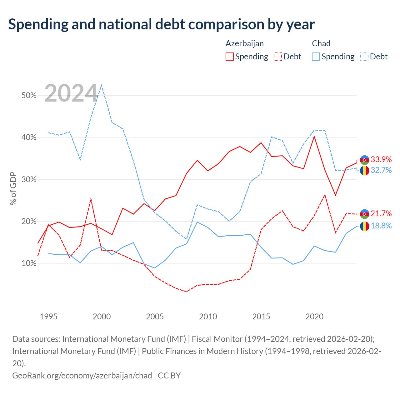 Azerbaijan has $16.1B in government debt (21.7% of GDP), compared to $6.37B (32.7% of GDP) in Chad.