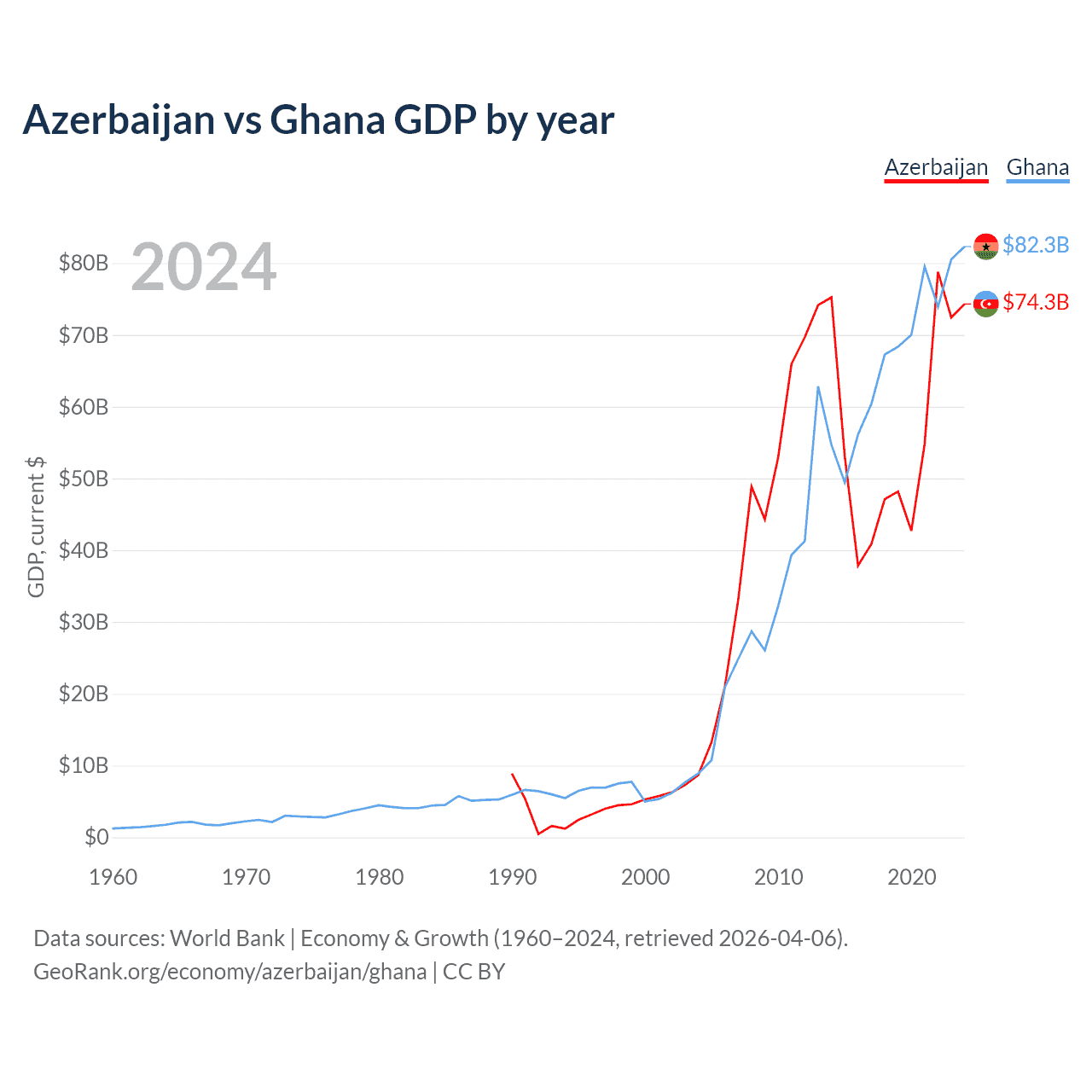 Azerbaijan has a GDP of $74.3B compared to $82.3B for Ghana, ranking 84/197 and 80/197 by economy size, respectively.