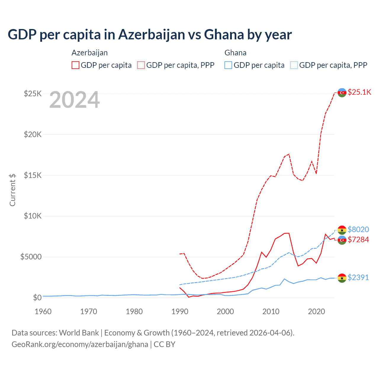 GDP per capita in Azerbaijan vs Ghana by year