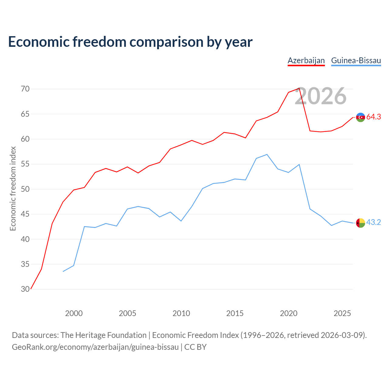 The Economic Freedom Index for Azerbaijan is 64.3, ranking 74/197, compared to 43.2 for Guinea-Bissau, ranking 181/197. The chart above displays a comparison of annual changes in economic freedom indexes.