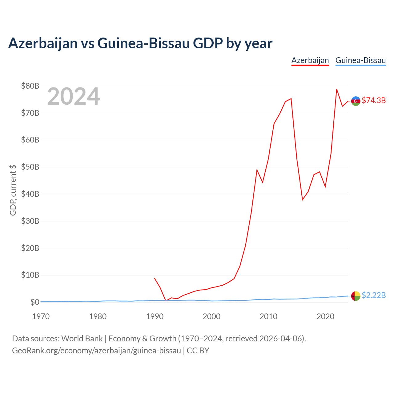 Azerbaijan has a GDP of $74.3B compared to $2.22B for Guinea-Bissau, ranking 84/197 and 176/197 by economy size, respectively.