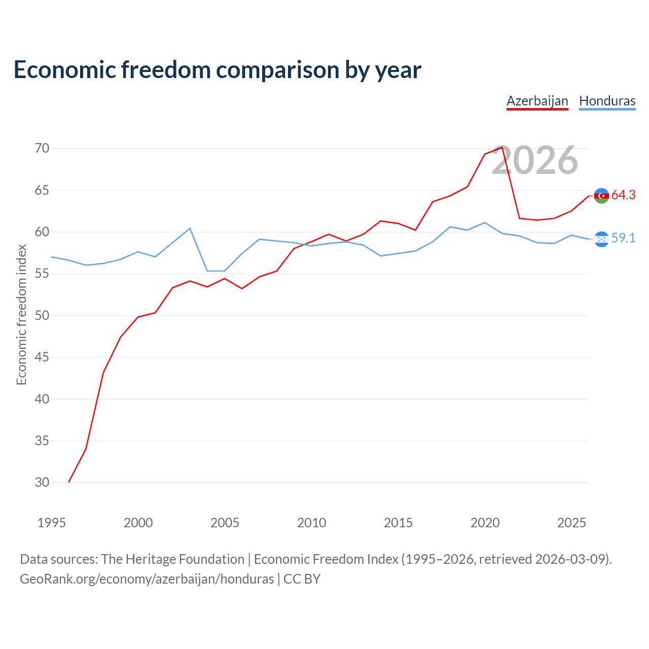 The Economic Freedom Index for Azerbaijan is 64.3, ranking 74/197, compared to 59.1 for Honduras, ranking 105/197. The chart above displays a comparison of annual changes in economic freedom indexes.