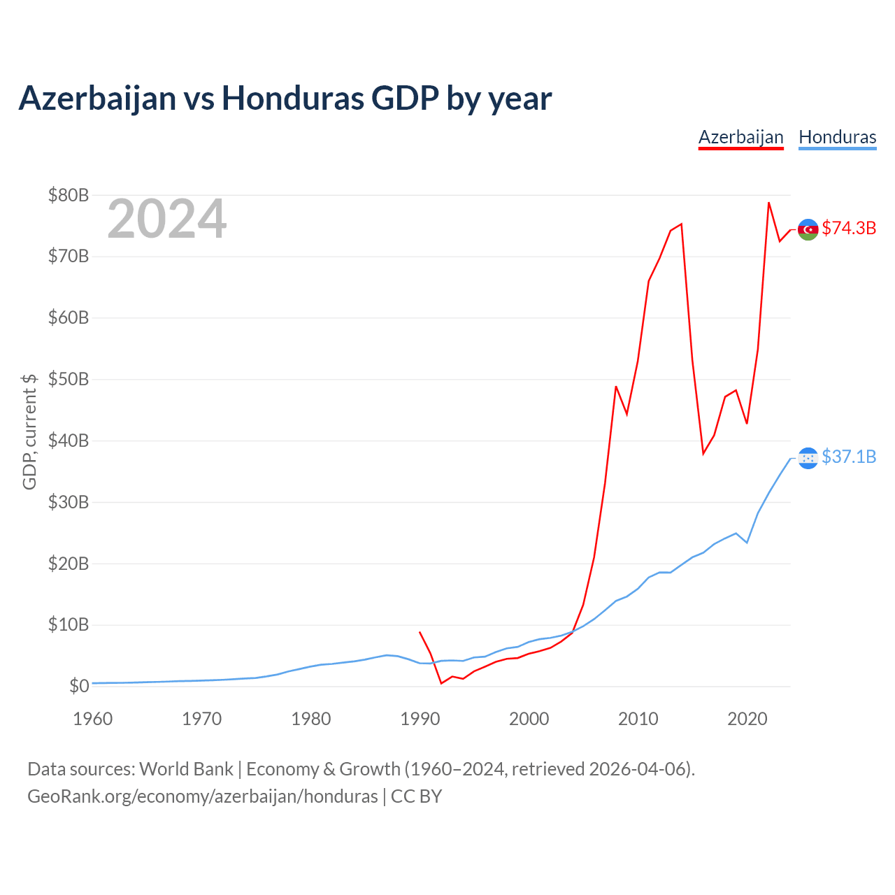 Azerbaijan has a GDP of $74.3B compared to $37.1B for Honduras, ranking 84/197 and 104/197 by economy size, respectively.