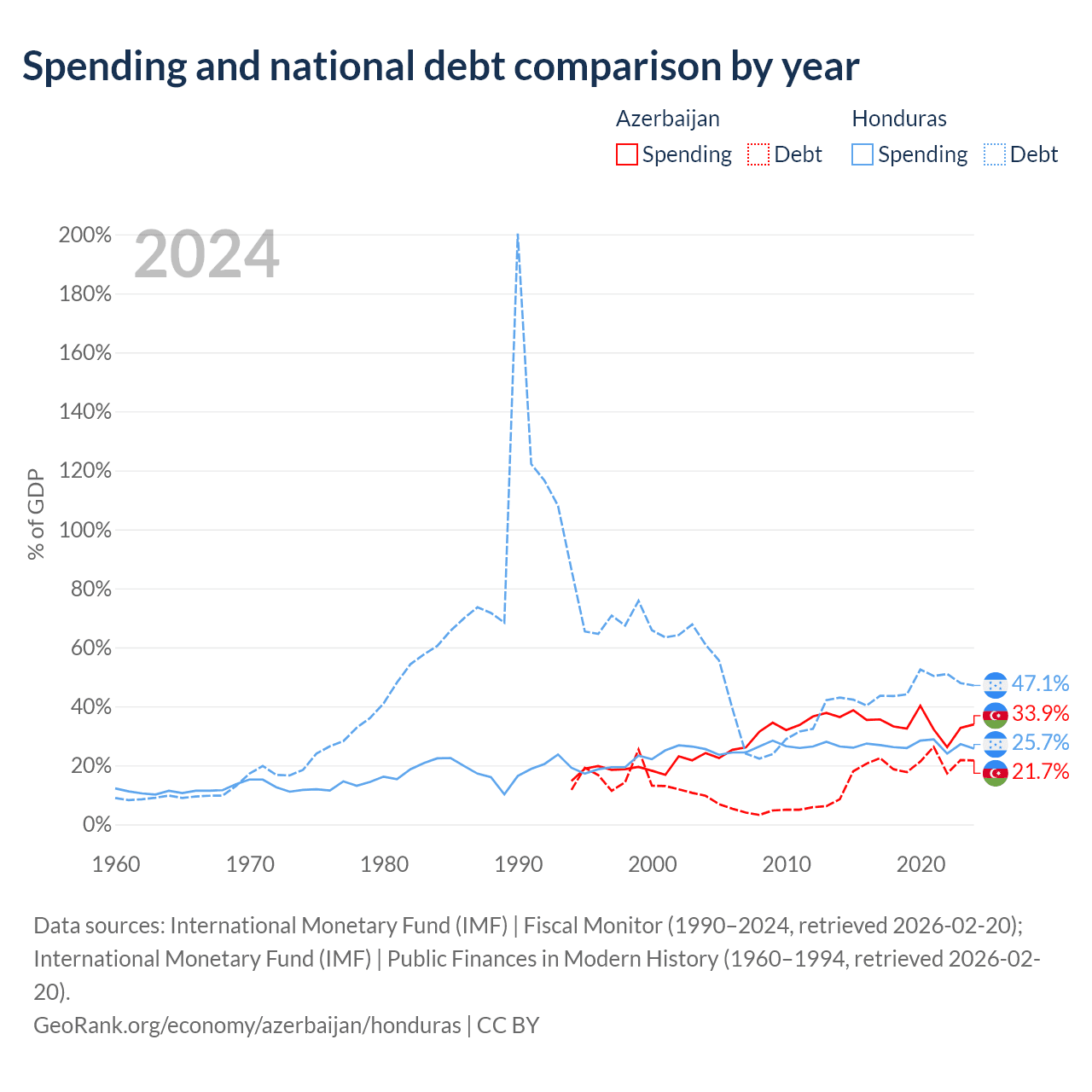Azerbaijan has $16.1B in government debt (21.7% of GDP), compared to $17.5B (47.1% of GDP) in Honduras.