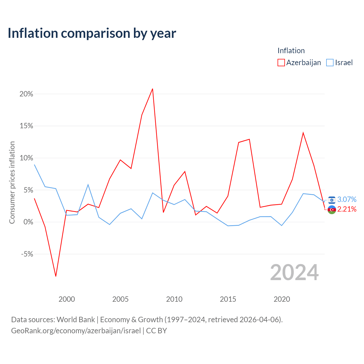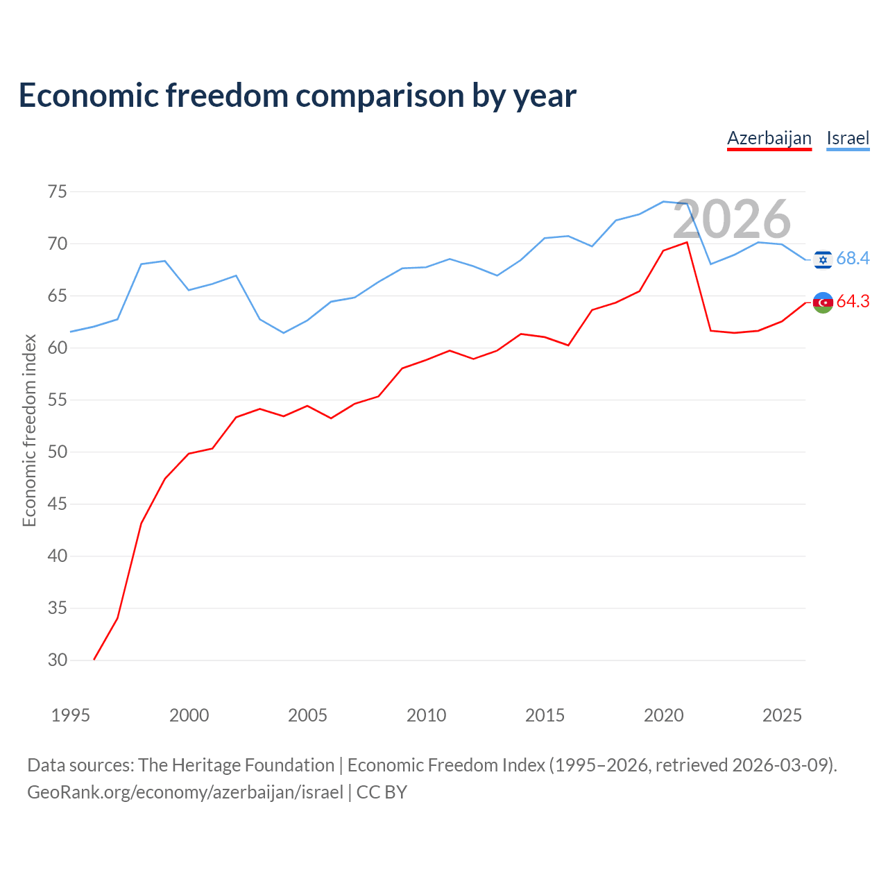 The Economic Freedom Index for Azerbaijan is 64.3, ranking 74/197, compared to 68.4 for Israel, ranking 47/197. The chart above displays a comparison of annual changes in economic freedom indexes.