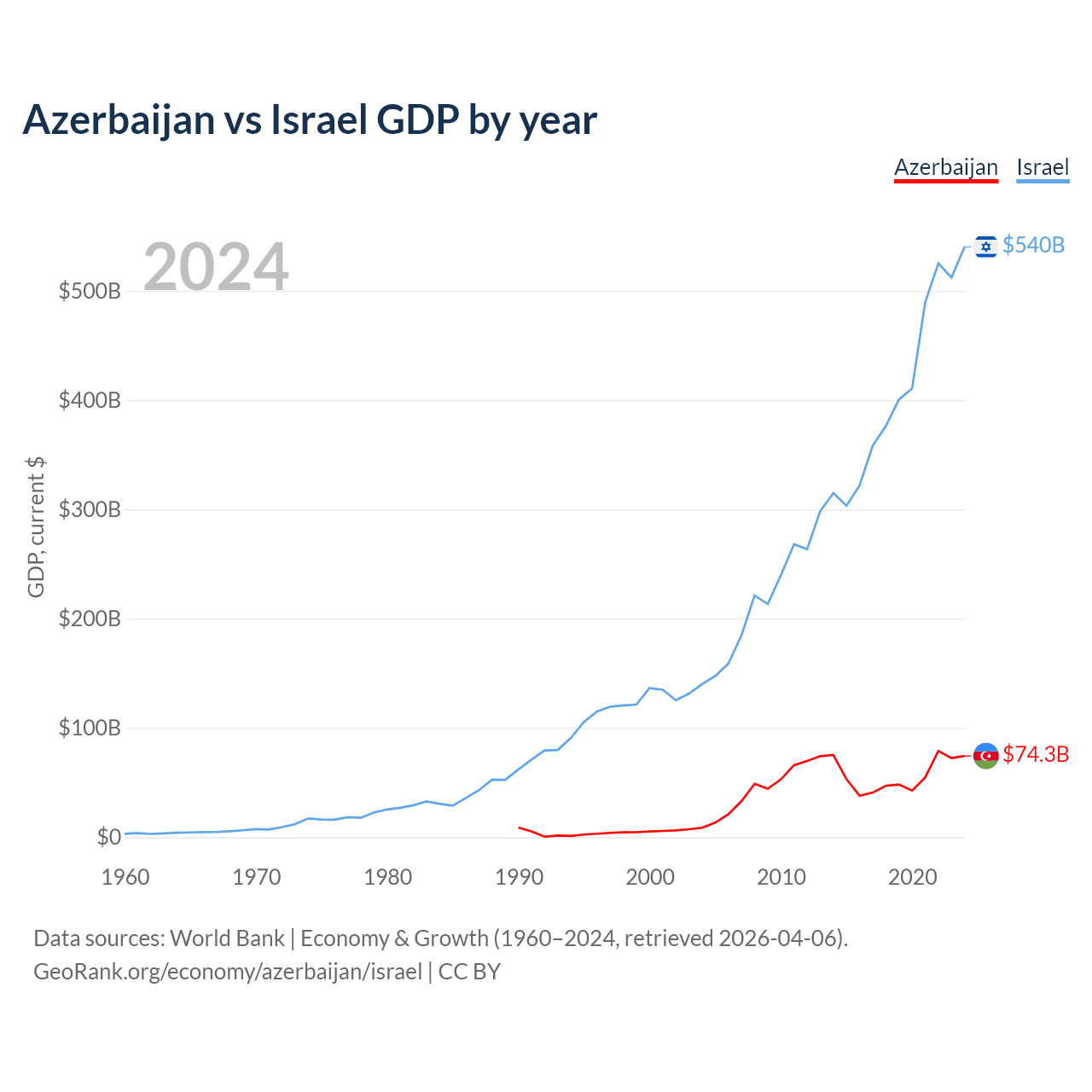 Azerbaijan has a GDP of $74.3B compared to $540B for Israel, ranking 84/197 and 29/197 by economy size, respectively.
