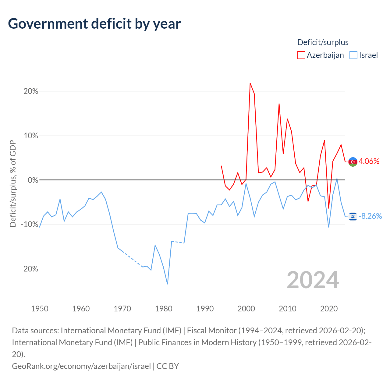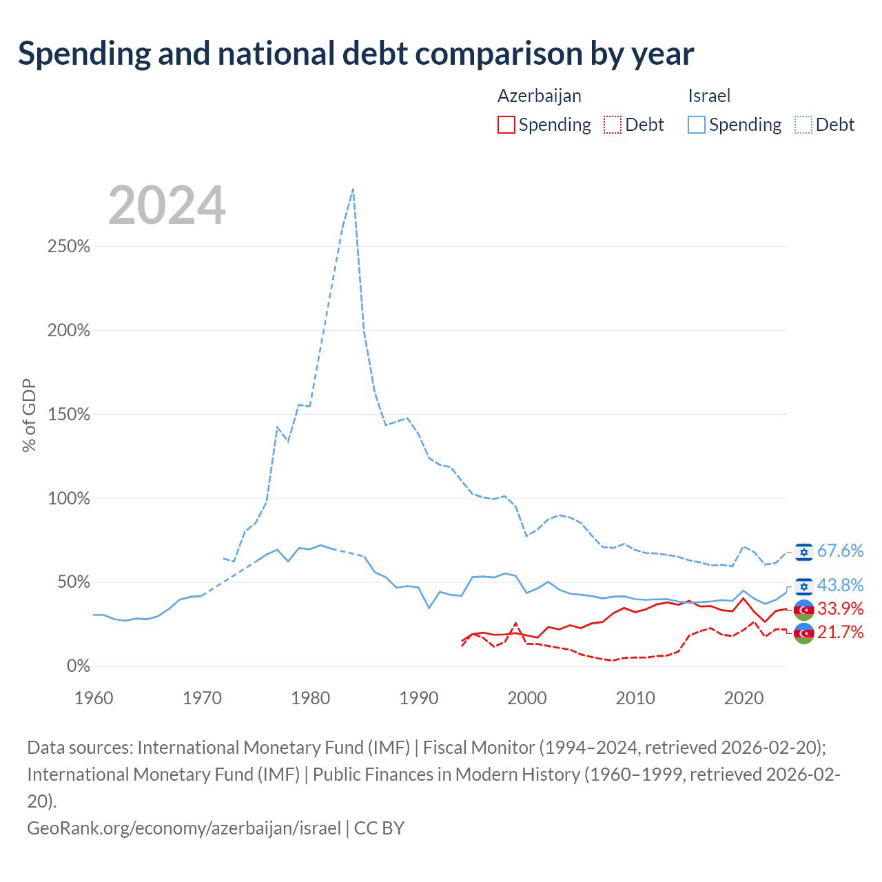 Azerbaijan has $16.1B in government debt (21.7% of GDP), compared to $366B (67.6% of GDP) in Israel.