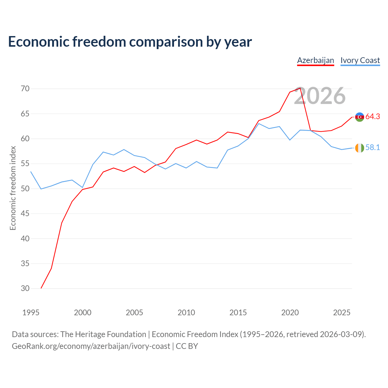 The Economic Freedom Index for Azerbaijan is 64.3, ranking 74/197, compared to 58.1 for Ivory Coast, ranking 111/197. The chart above displays a comparison of annual changes in economic freedom indexes.