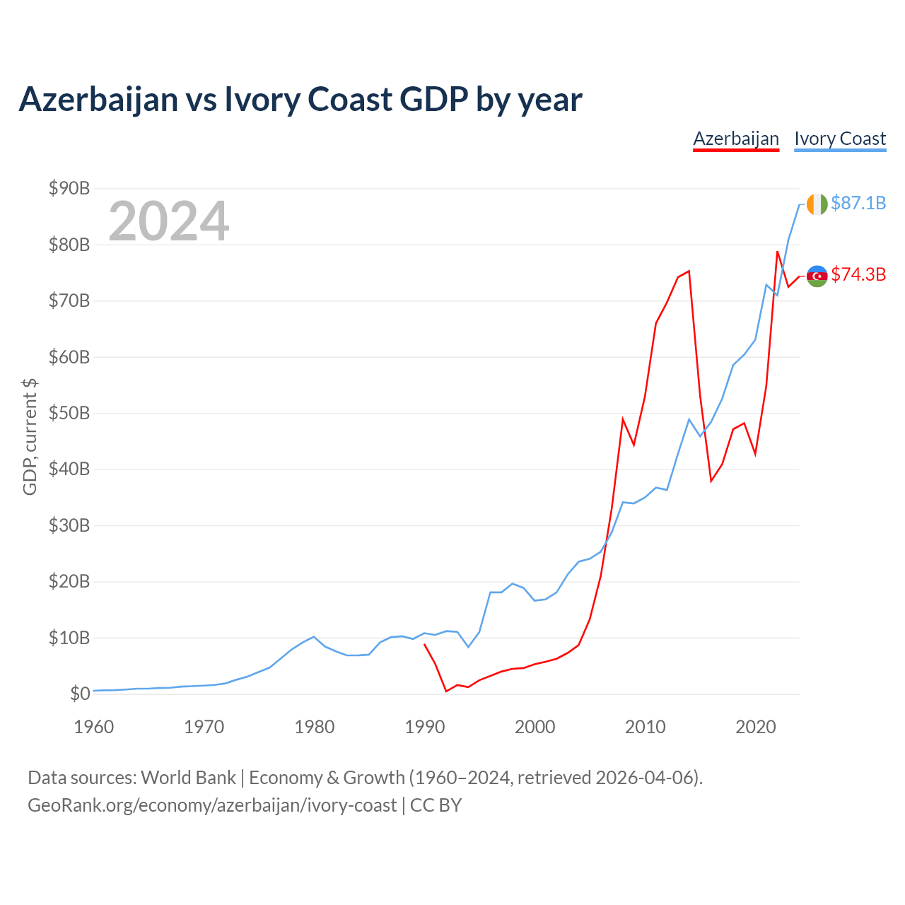 Azerbaijan has a GDP of $74.3B compared to $87.1B for Ivory Coast, ranking 84/197 and 77/197 by economy size, respectively.