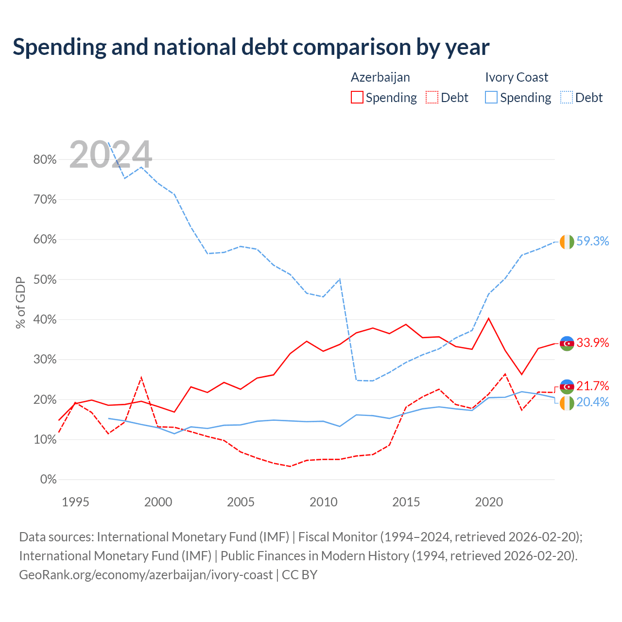 Azerbaijan has $16.1B in government debt (21.7% of GDP), compared to $51.6B (59.3% of GDP) in Ivory Coast.