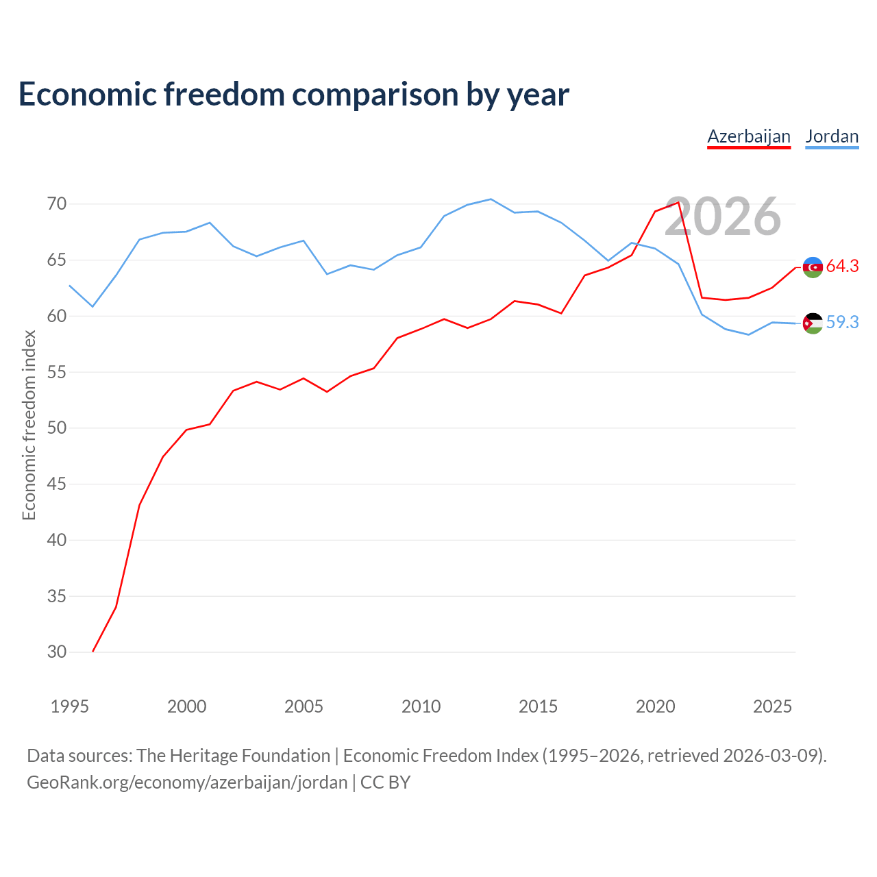 The Economic Freedom Index for Azerbaijan is 64.3, ranking 74/197, compared to 59.3 for Jordan, ranking 104/197. The chart above displays a comparison of annual changes in economic freedom indexes.