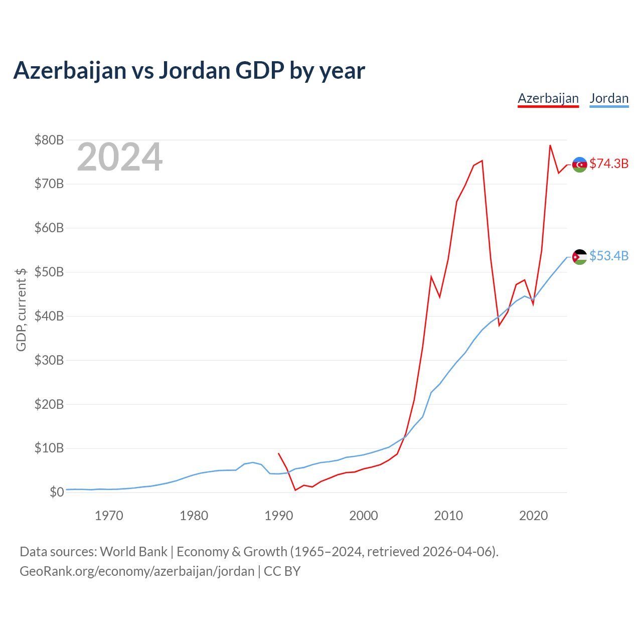 Azerbaijan has a GDP of $74.3B compared to $53.4B for Jordan, ranking 84/197 and 90/197 by economy size, respectively.