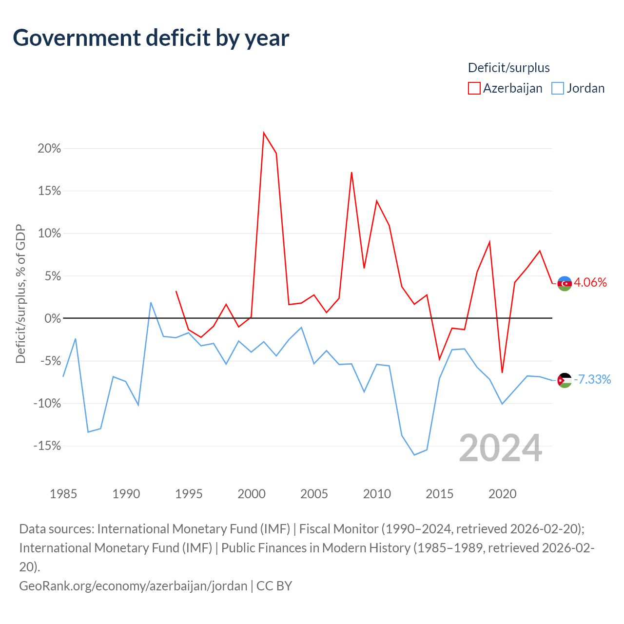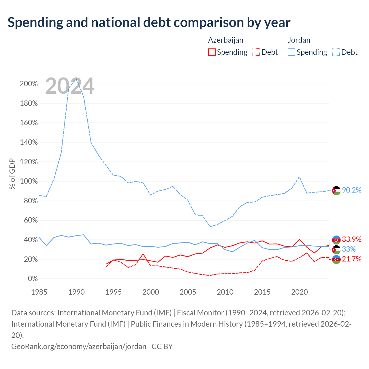 Azerbaijan has $16.1B in government debt (21.7% of GDP), compared to $48.1B (90.2% of GDP) in Jordan.