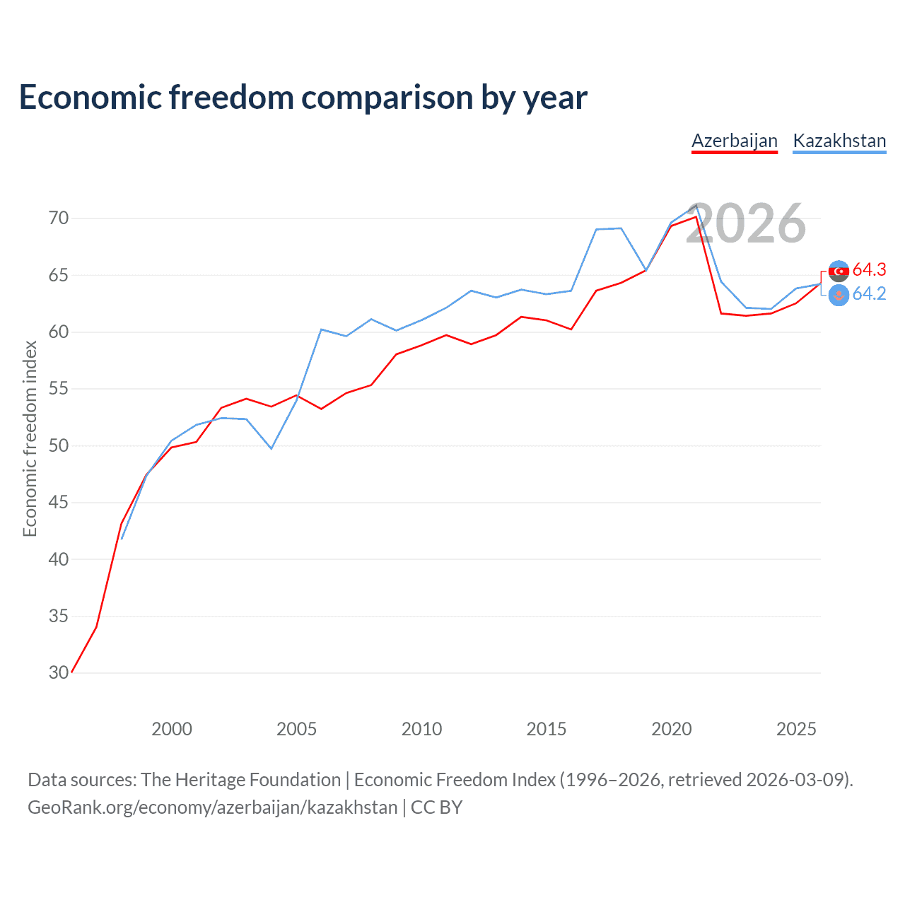 The Economic Freedom Index for Azerbaijan is 64.3, ranking 74/197, compared to 64.2 for Kazakhstan, ranking 75/197. The chart above displays a comparison of annual changes in economic freedom indexes.