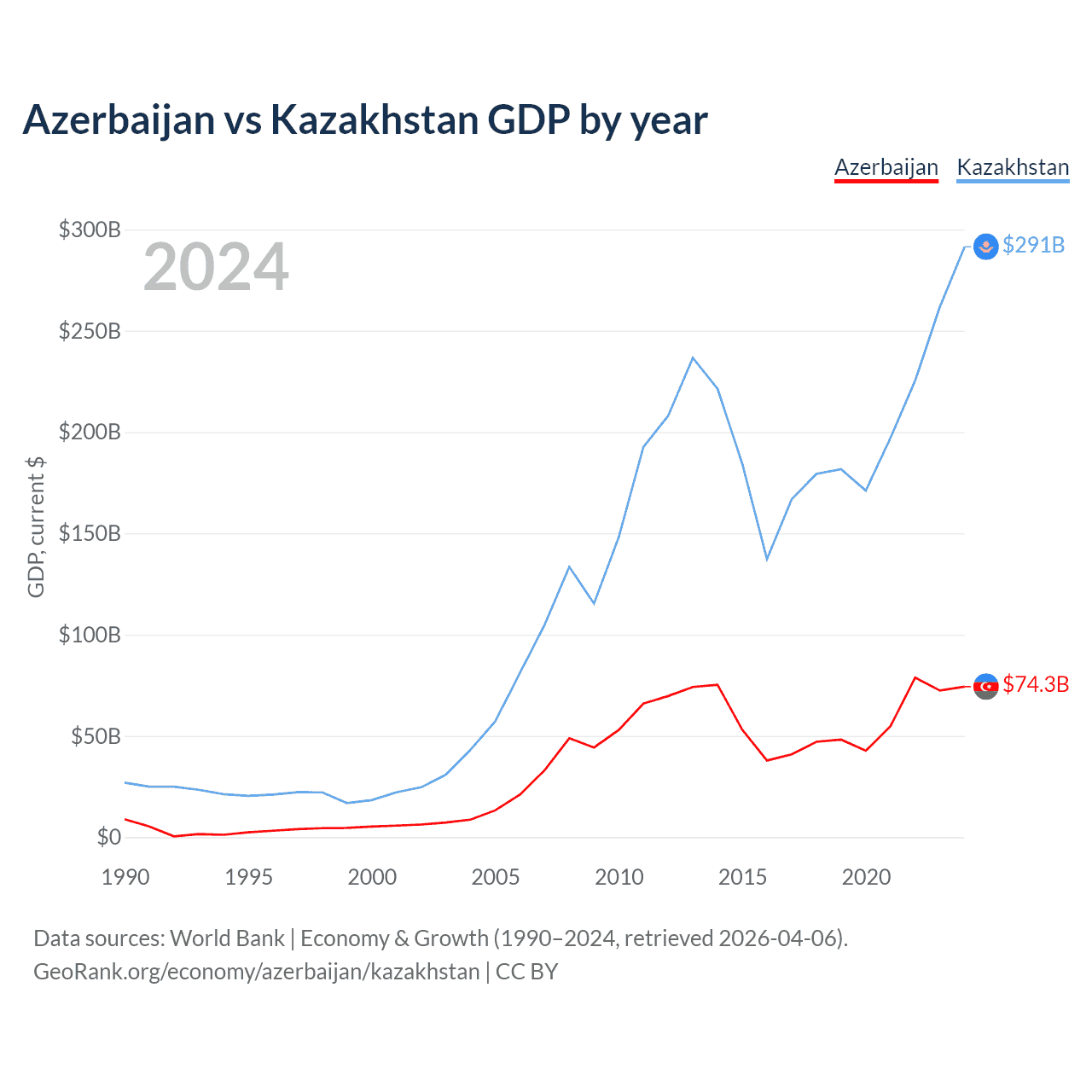 Azerbaijan has a GDP of $74.3B compared to $291B for Kazakhstan, ranking 84/197 and 48/197 by economy size, respectively.