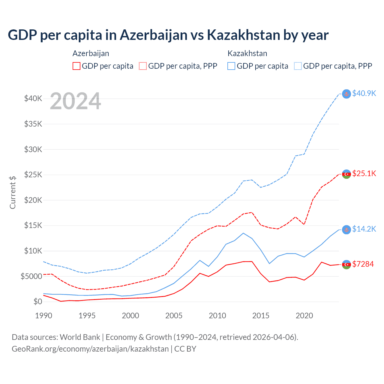 Azerbaijan's GDP per capita is $7,284, ranking 101/197, compared to $14,155 in Kazakhstan, ranking 71/197. Adjusted for purchasing power (GDP per capita PPP), Azerbaijan ranks 82nd at $25,089, while Kazakhstan ranks 58th at $40,891.