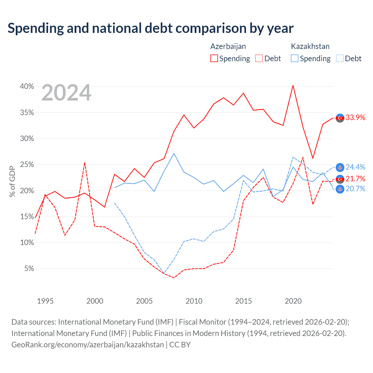 Azerbaijan has $16.1B in government debt (21.7% of GDP), compared to $71.1B (24.4% of GDP) in Kazakhstan.