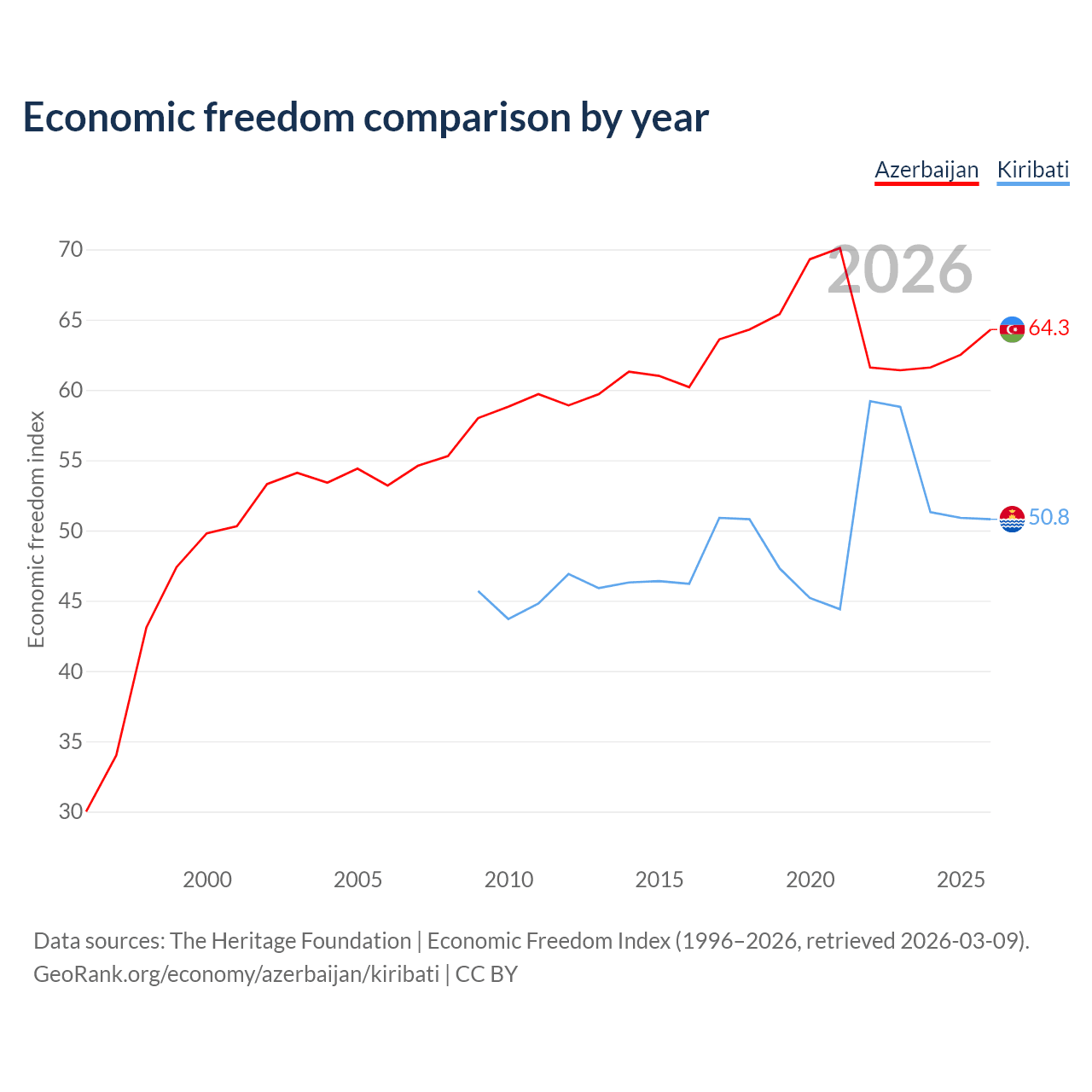The Economic Freedom Index for Azerbaijan is 64.3, ranking 74/197, compared to 50.8 for Kiribati, ranking 158/197. The chart above displays a comparison of annual changes in economic freedom indexes.