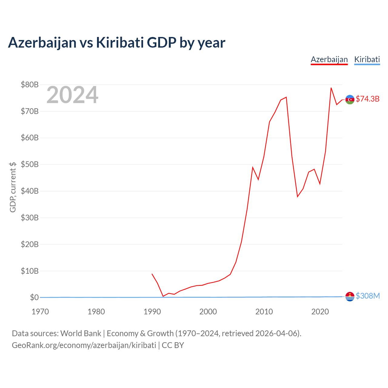 Azerbaijan has a GDP of $74.3B compared to $308M for Kiribati, ranking 84/197 and 192/197 by economy size, respectively.