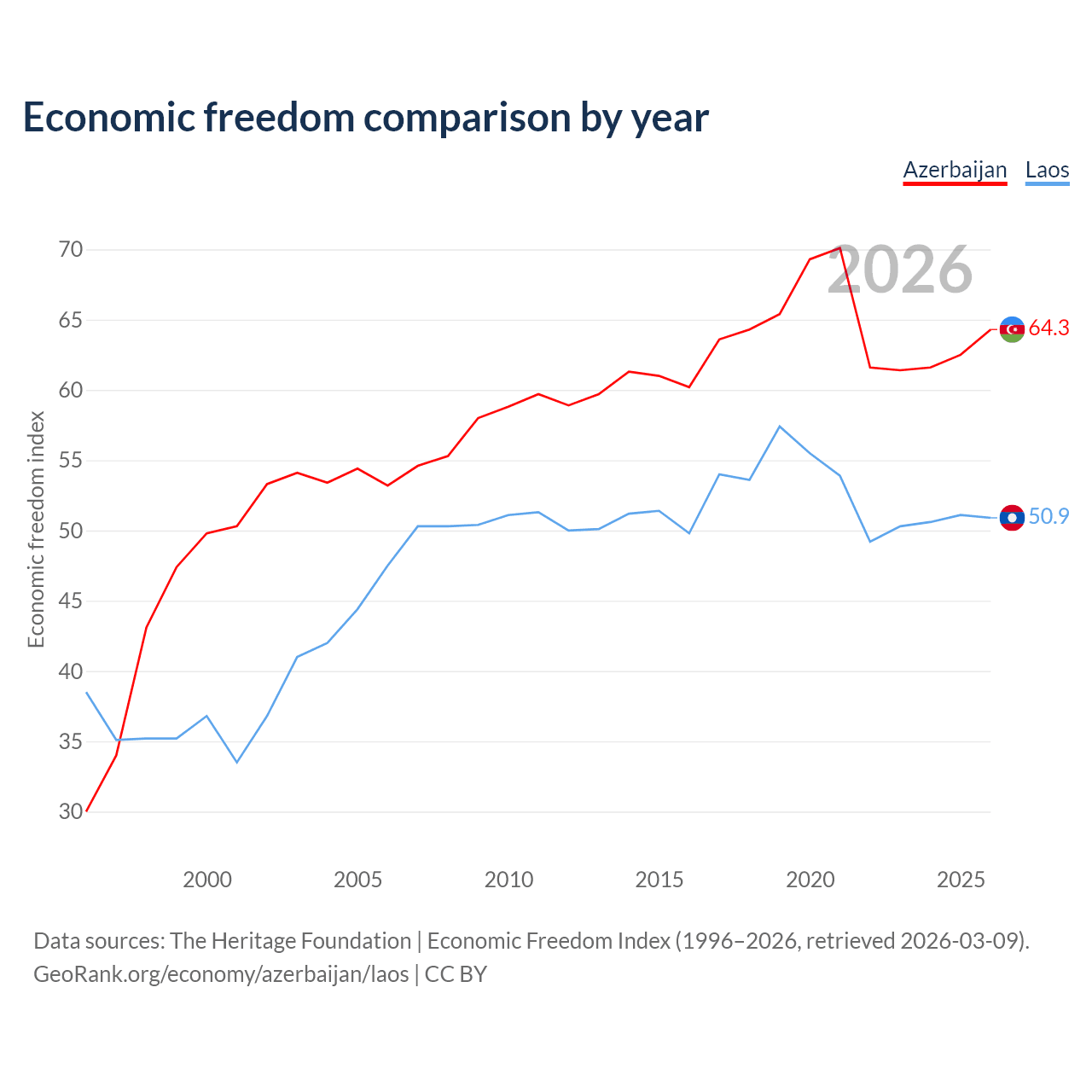 The Economic Freedom Index for Azerbaijan is 64.3, ranking 74/197, compared to 50.9 for Laos, ranking 157/197. The chart above displays a comparison of annual changes in economic freedom indexes.
