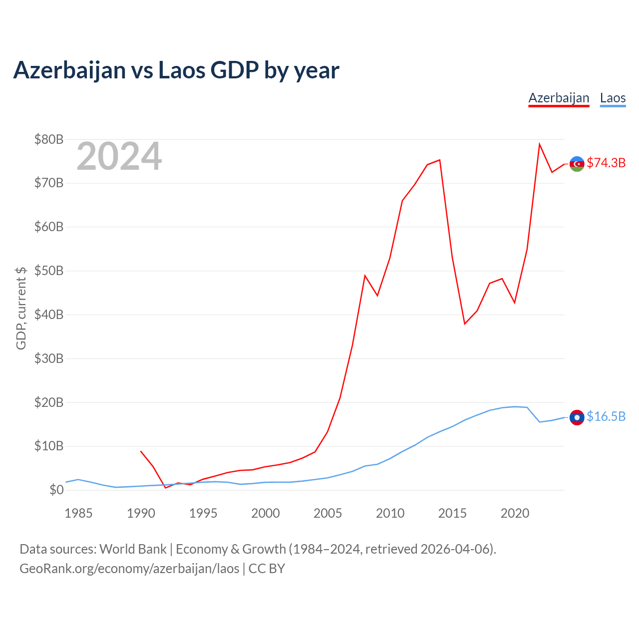 Azerbaijan has a GDP of $74.3B compared to $16.5B for Laos, ranking 84/197 and 139/197 by economy size, respectively.