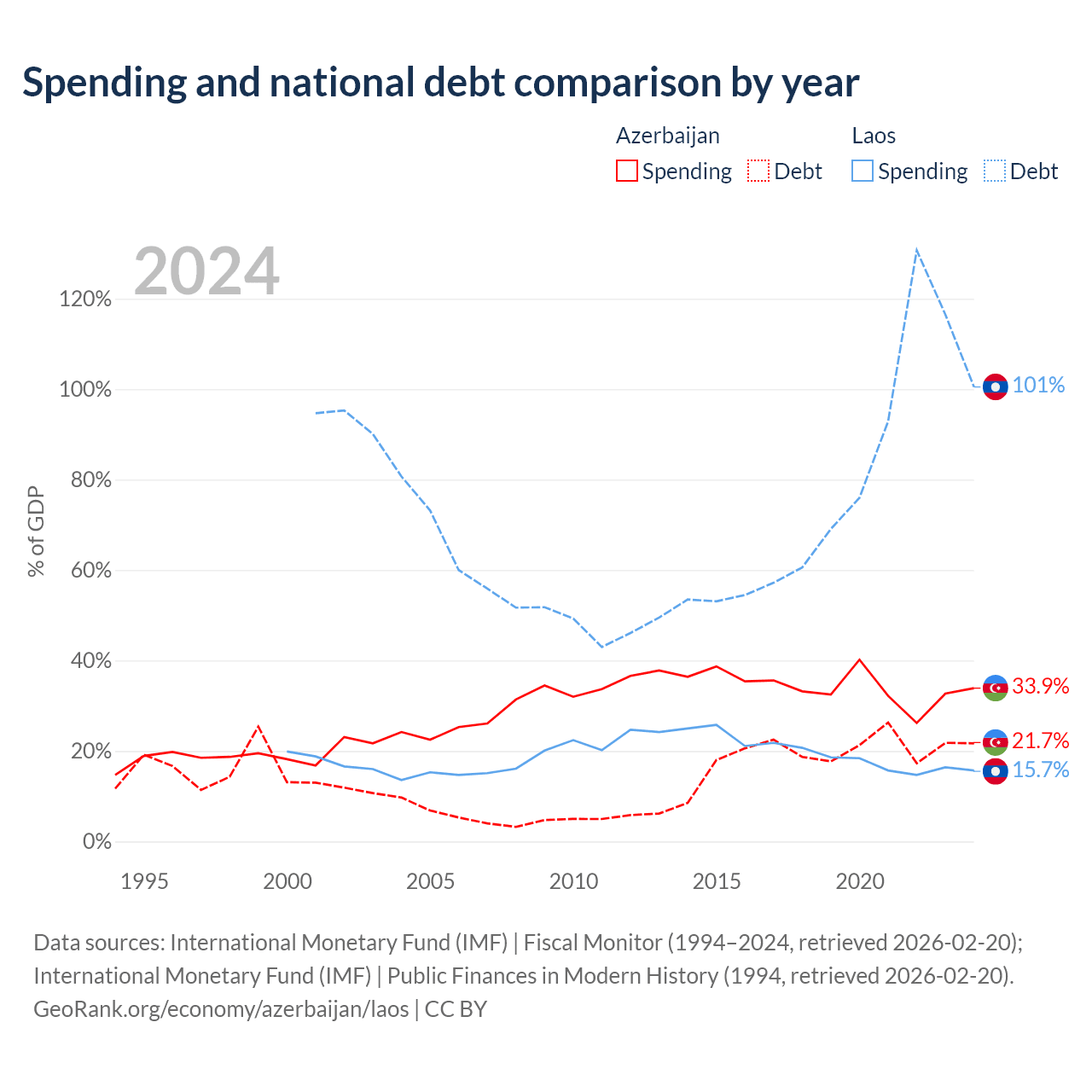 Azerbaijan has $16.1B in government debt (21.7% of GDP), compared to $16.6B (100.5% of GDP) in Laos.