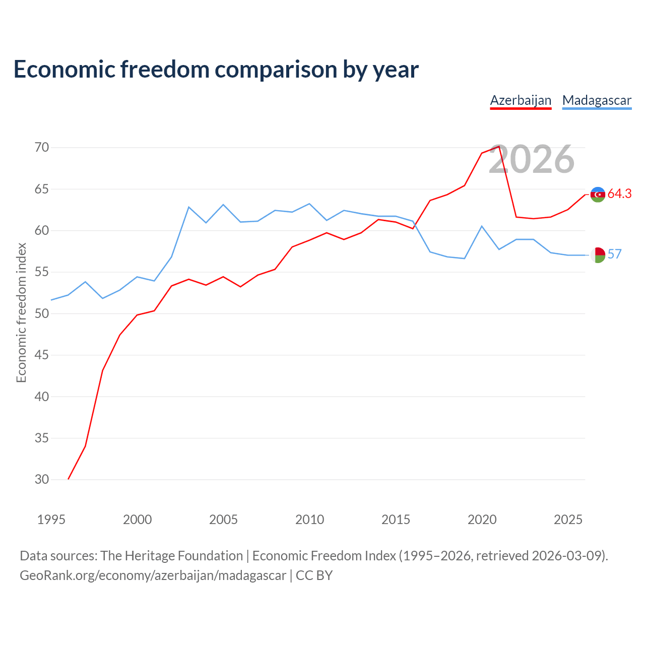 The Economic Freedom Index for Azerbaijan is 64.3, ranking 74/197, compared to 57 for Madagascar, ranking 119/197. The chart above displays a comparison of annual changes in economic freedom indexes.