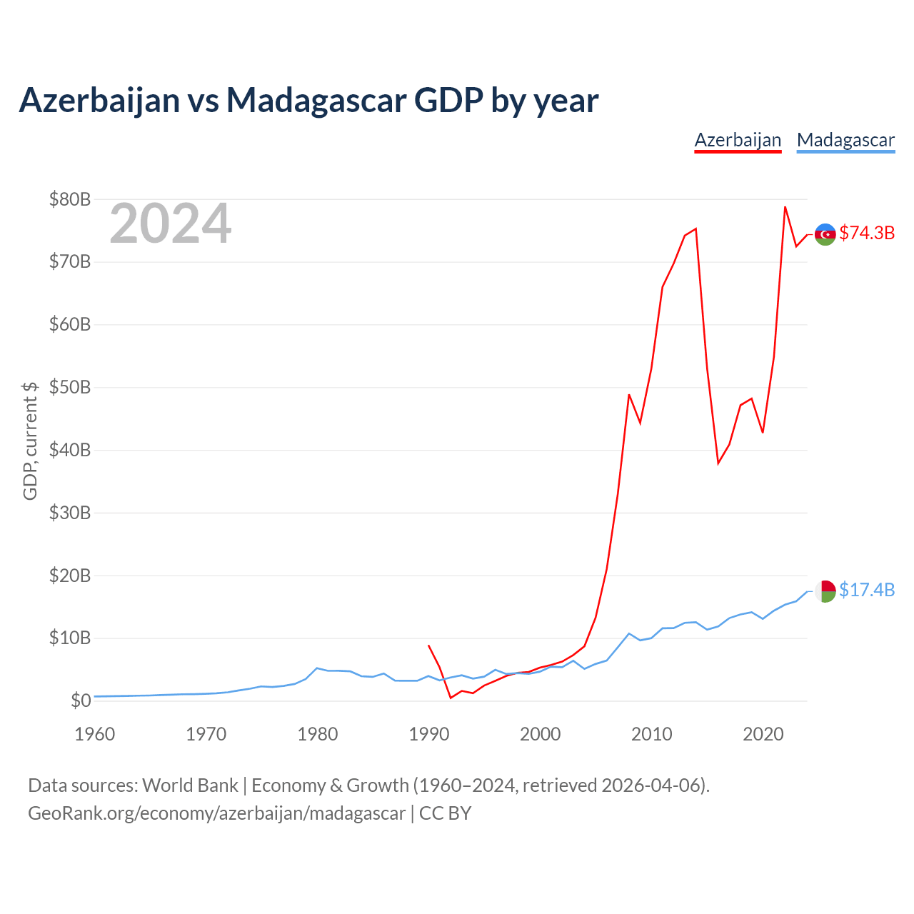 Azerbaijan has a GDP of $74.3B compared to $17.4B for Madagascar, ranking 84/197 and 136/197 by economy size, respectively.
