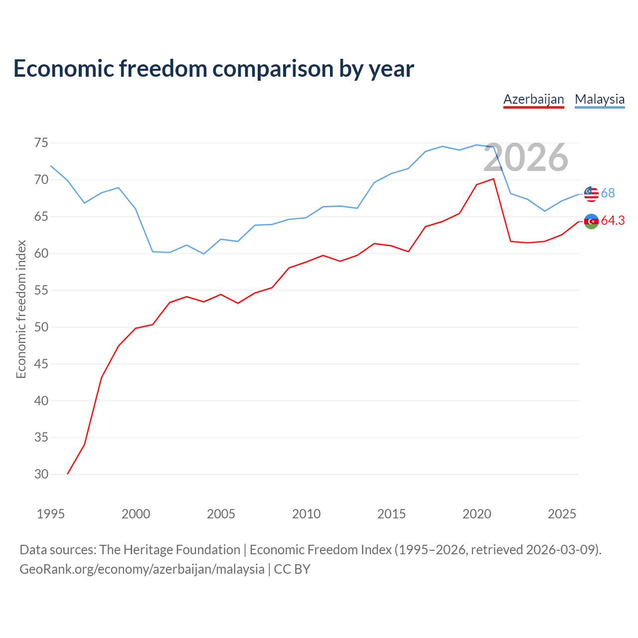 The Economic Freedom Index for Azerbaijan is 64.3, ranking 74/197, compared to 68 for Malaysia, ranking 51/197. The chart above displays a comparison of annual changes in economic freedom indexes.