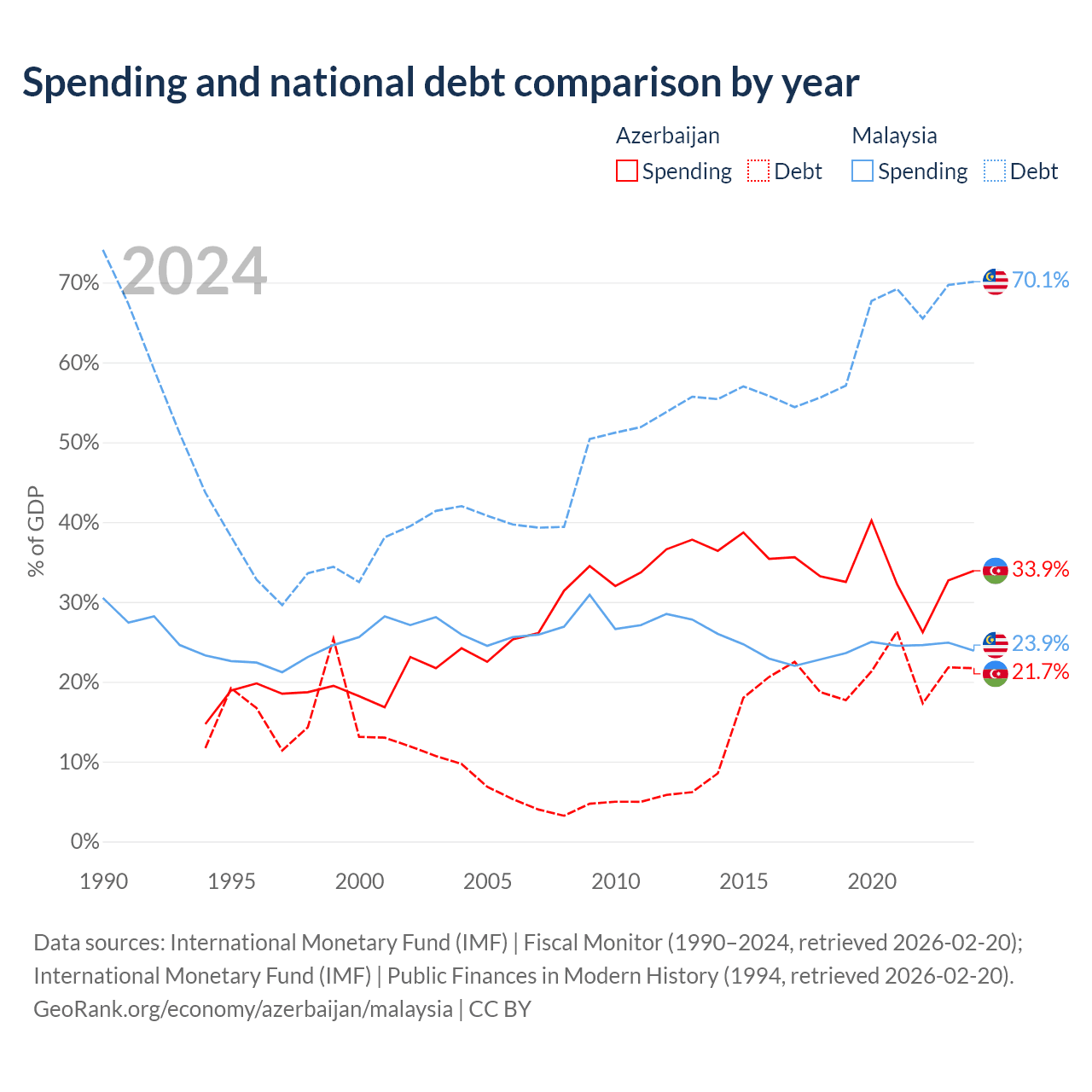 Azerbaijan has $16.1B in government debt (21.7% of GDP), compared to $296B (70.1% of GDP) in Malaysia.