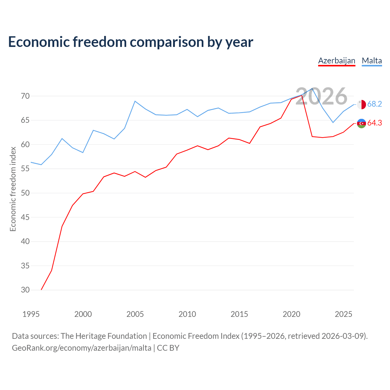 The Economic Freedom Index for Azerbaijan is 64.3, ranking 74/197, compared to 68.2 for Malta, ranking 49/197. The chart above displays a comparison of annual changes in economic freedom indexes.