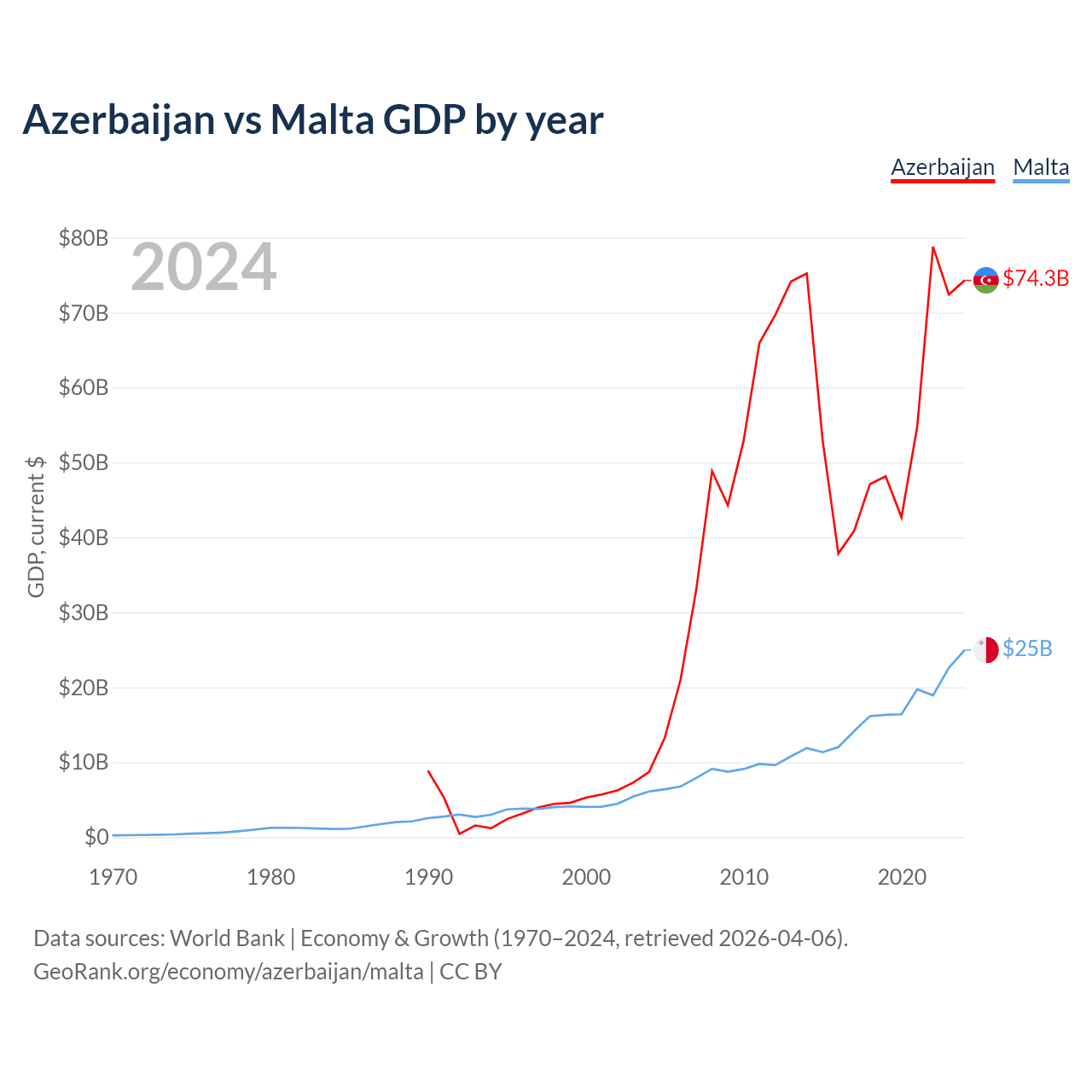 Azerbaijan has a GDP of $74.3B compared to $25B for Malta, ranking 84/197 and 119/197 by economy size, respectively.